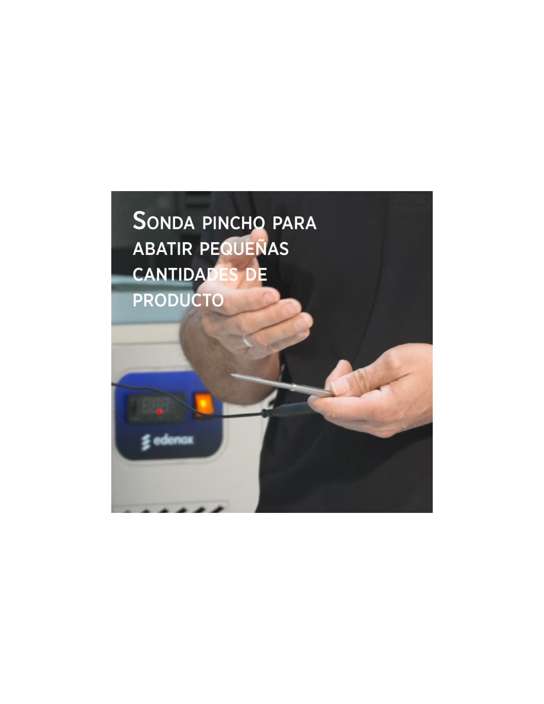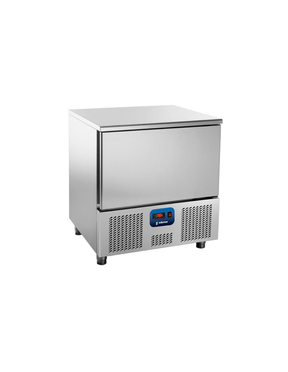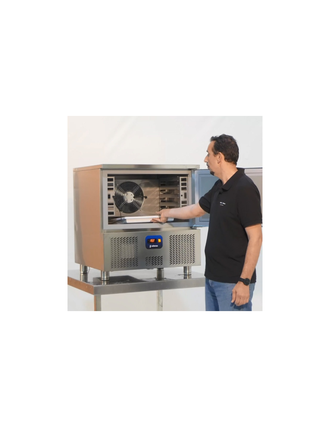 Abatidor de temperatura con capacidad para 5 bandejas GN1/1 o 60x40 cm, enfría o congela alimentos desde +90°C / +3°C y desde +90°C hasta -18°C. Incluye sonda calefactada para asegurar un control preciso de la temperatura y poder retirar fácilmente en ciclos de congelación. Cumple con normativas HACCP, garantizando calidad y seguridad. Medidas: 790 x 700...