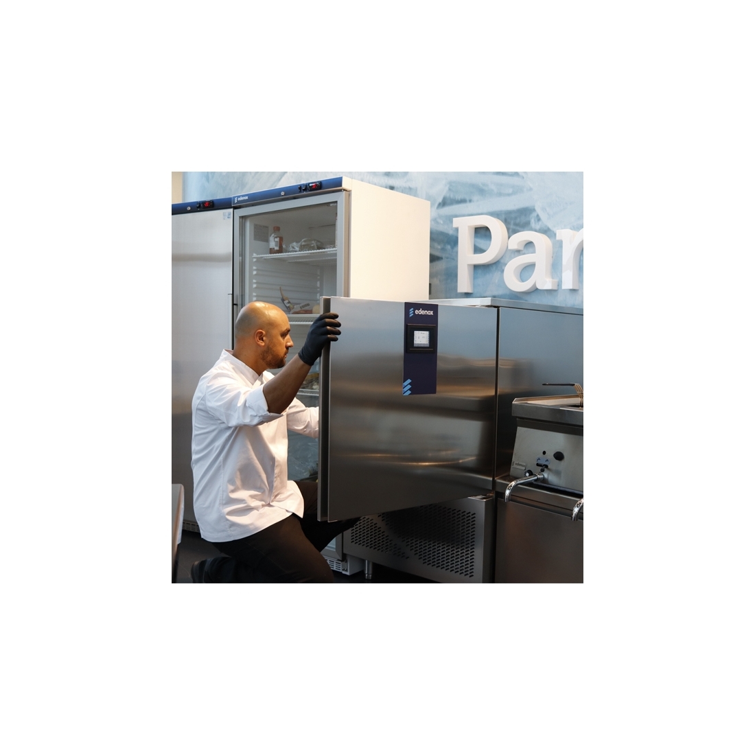 Abatidor y Congelador de temperatura. Controlador de fácil uso y mayor precisión en temperatura. Puerta con calefacción y burletes reemplazables. Conexión USB, recetas HACCP, ciclos personalizados y gestión de abatimiento/congelación. Sonda calefactada y capacidad para 99 programas personalizados. Capacidad 3 GN 1/1.
