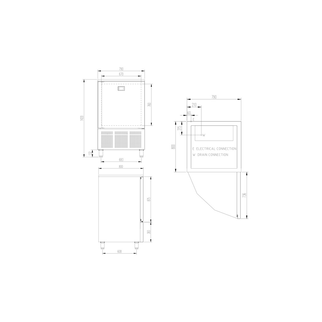 Abatidor-congelador profesional de 5 bandejas GN con ciclos de +90 °C a +3 °C y de +90 °C a –18 °C. Producción de 25 kg en abatimiento y 15 kg en congelación. Potencia 550 W, control electrónico y gas R-290. Medidas: 790 × 700 × 850 mm. Tensión: 230 V.