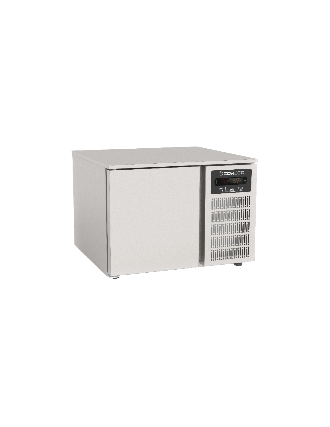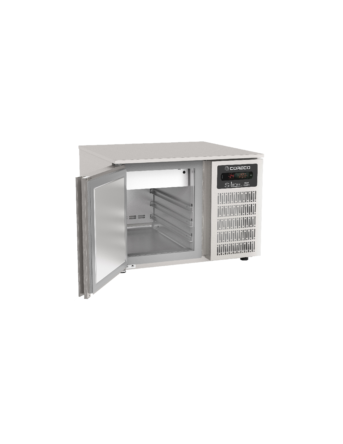 Abatidor de temperatura A3N-S de Coreco, este equipo está fabricado en acero inoxidable AISI-304, lo que garantiza su durabilidad y resistencia. Cuenta con un avanzado panel de control digital con pantalla táctil que permite una gestión eficiente de los ciclos de abatimiento y congelación. Incluye una sonda de pincho desmontable y permite la programación de ciclos por tiempo o temperatura. Su sistema de refrigeración y evaporador de tiro forzado aseguran un rendimiento óptimo. Además, ofrece una eficiente gestión del consumo de energía y la posibilidad de gestionar alarmas HACCP directamente desde la pantalla del controlador.