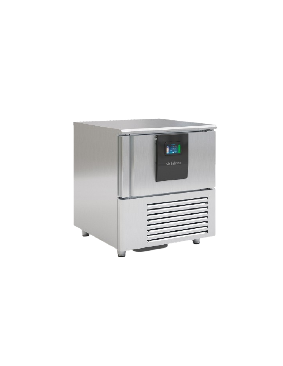 Abatidor de temperatura con capacidad para 5 bandejas GN 1/1 o 4 de 60x40 cm. Construido en acero inoxidable AISI-304, resistente, eficaz y de última generación. Cuenta con control digital y sonda de pincho desmontable. Refrigeración por tiro forzado, gestión eficiente de ciclos y alarmas HACCP.