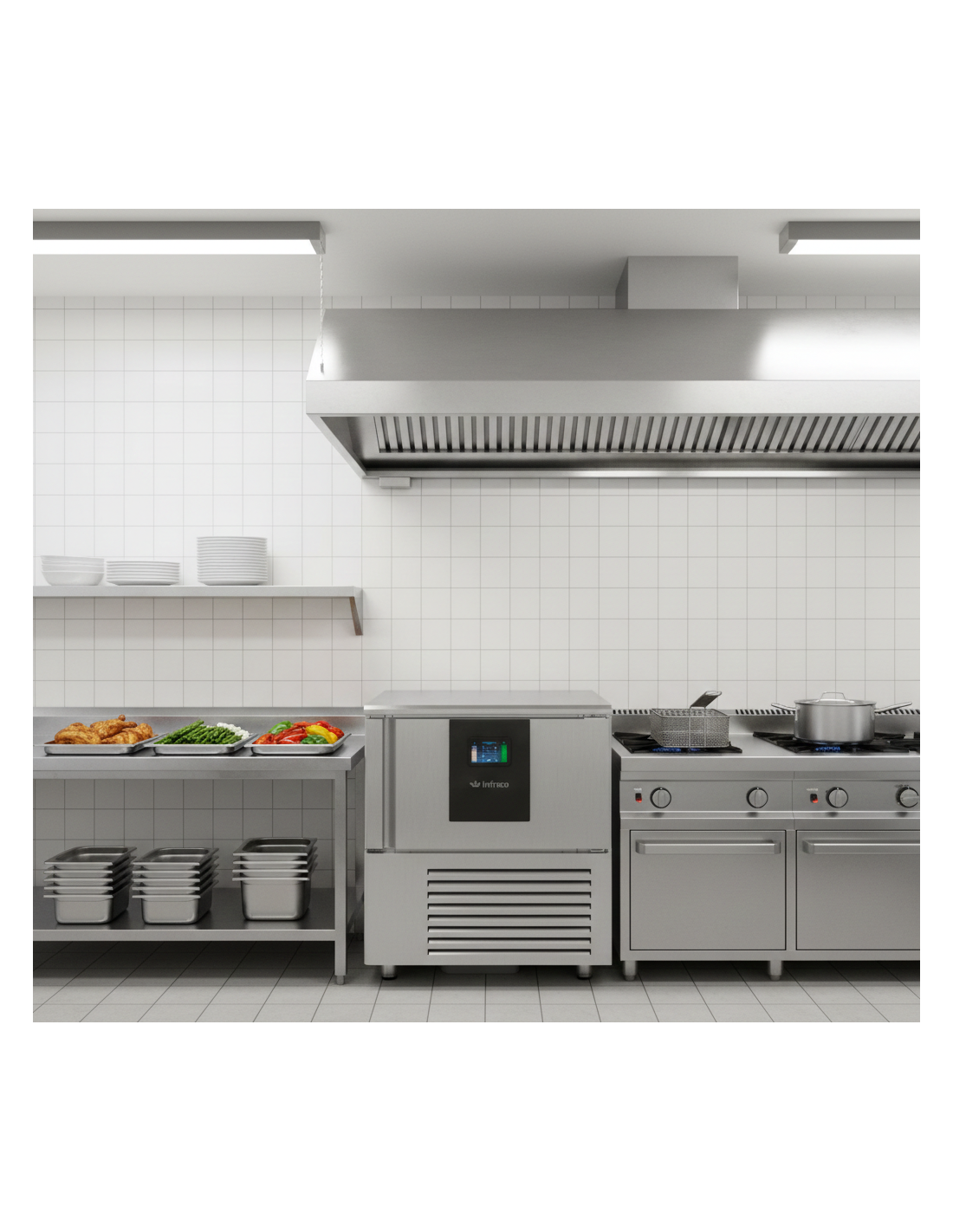 Abatidor de temperatura con capacidad para 5 bandejas GN1/1 o 60x40 cm, enfría o congela alimentos desde +90°C / +3°C y desde +90°C hasta -18°C. Incluye sonda calefactada para asegurar un control preciso de la temperatura y poder retirar fácilmente en ciclos de congelación. Cumple con normativas HACCP, garantizando calidad y seguridad. Medidas: 790 x 700...