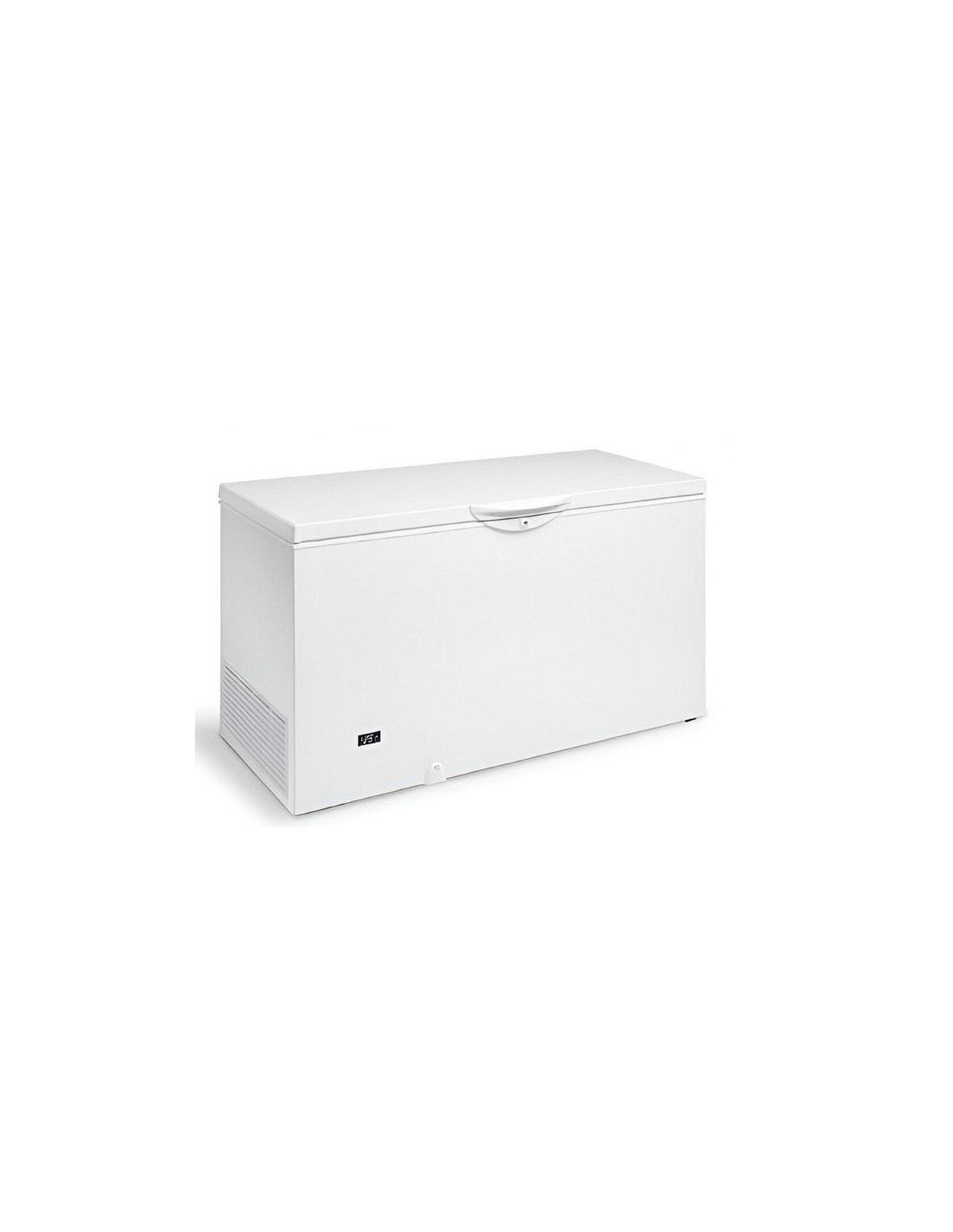 Congelador horizontal con tapa abatible y capacidad de 402 litros. Rango de temperatura: -14º / -25ºC. Dotado de cierre con llave y desagüe interior.