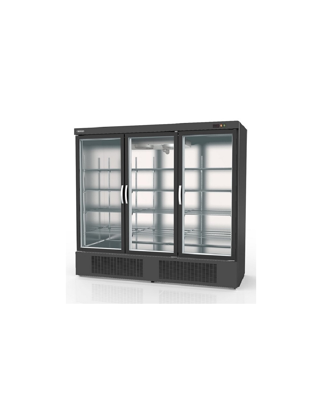 Frigorífico expositor de 3 puertas correderas de cristal, con capacidad de hasta 1600 litros. Equipado con 15 estantes regulables en altura. Sistema anti condensación de las puertas. Sistema de enfriamiento dinámico con evaporador ventilado. Evaporación automática del agua de desescarche. Dispone de termostato digital Carel. Capacidad: 1840 latas de 33cl.