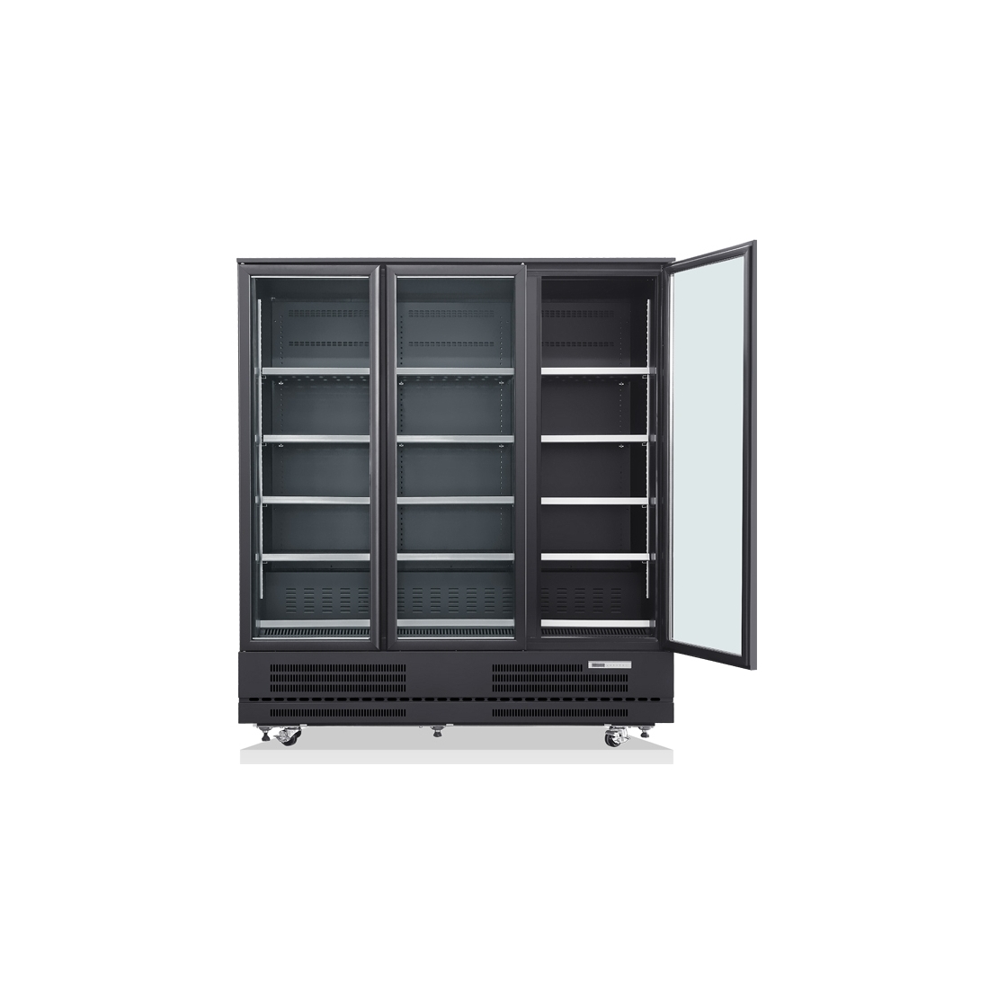 Frigorífico expositor de 3 puertas correderas de cristal, con capacidad de hasta 1600 litros. Equipado con 15 estantes regulables en altura. Sistema anti condensación de las puertas. Sistema de enfriamiento dinámico con evaporador ventilado. Evaporación automática del agua de desescarche. Dispone de termostato digital Carel. Capacidad: 1840 latas de 33cl.