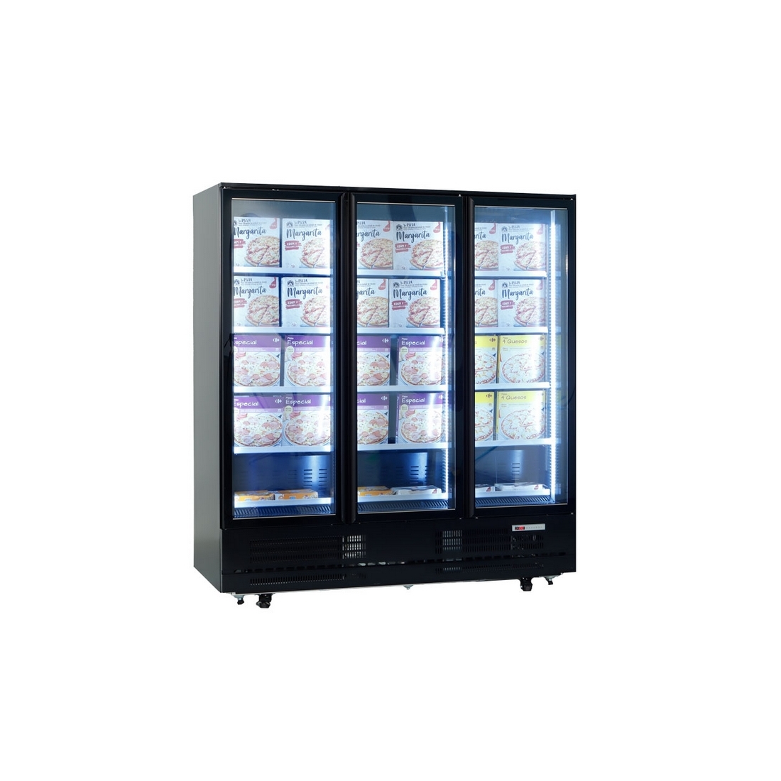 Armario frigorífico expositor de 3 puertas abatibles, con capacidad de hasta 1264 litros. Equipado con 12 estantes regulables en altura. Refrigeración ventilada, descarche automático, evaporador con recubrimiento anticorrosión. Capacidad: 1520 latas de 33cl.