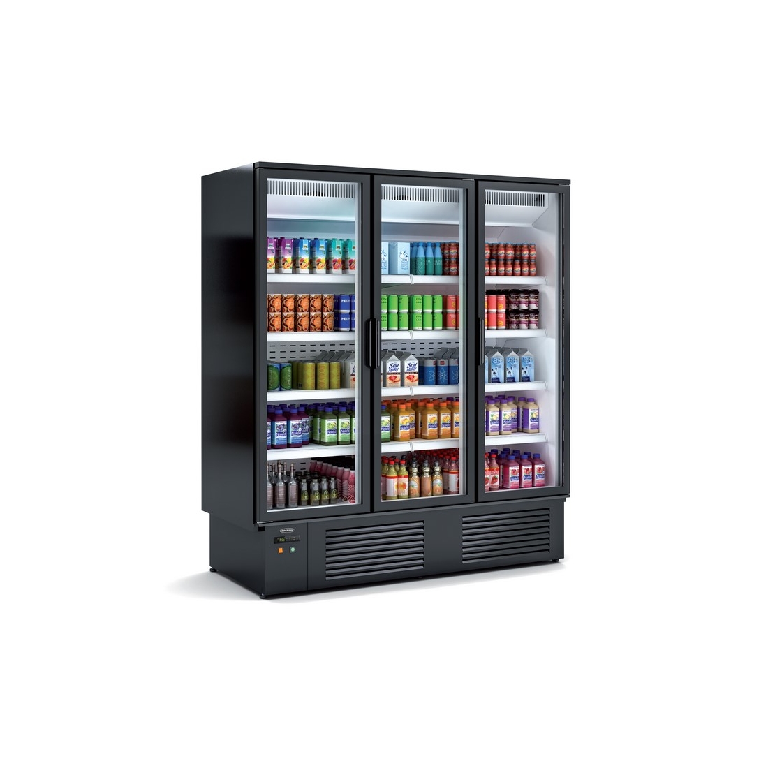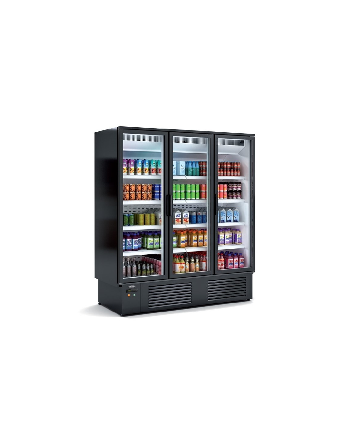 Frigorífico expositor de 3 puertas correderas de cristal, con capacidad de hasta 1600 litros. Equipado con 15 estantes regulables en altura. Sistema anti condensación de las puertas. Sistema de enfriamiento dinámico con evaporador ventilado. Evaporación automática del agua de desescarche. Dispone de termostato digital Carel. Capacidad: 1840 latas de 33cl.