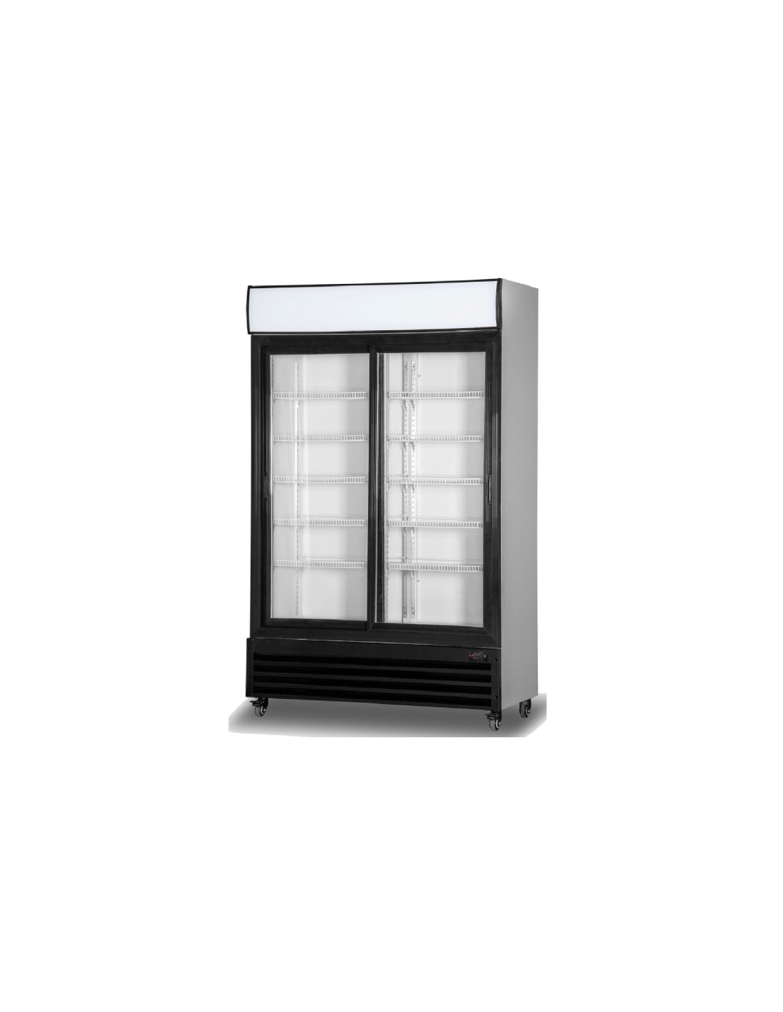 Armario expositor refrigerado de 900 litros con 2 puertas correderas de cristal, refrigeración ventilada y control digital. Iluminación LED vertical, gas R290 y compresor Donper. Potencia nominal 420 W. Ideal para bebidas y alimentos. Medidas: 112 × 61 × 197 cm. Tensión: 230 V.