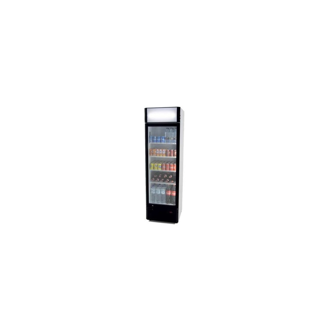 Frigorífico expositor con 1 puerta de cristal. Tiene una capacidad de hasta 372 litros y 5 estantes de serie. Equipado con termómetro y control de la temperatura mecánico. El evaporador es estático asistido por ventilador. Incluye sistema de evaporación automático. Cuenta con luz LED y cristal doble templado. Está diseñado totalmente en color negro...