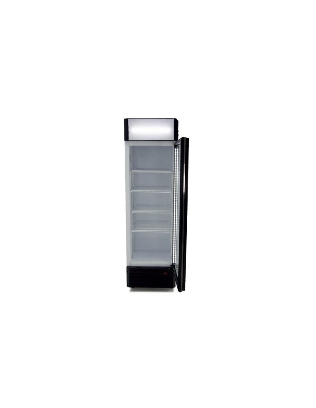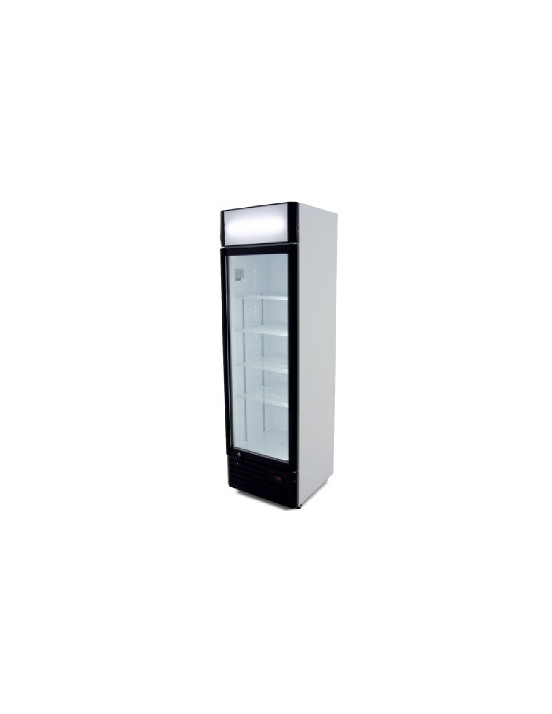 Mini expositor refrigerado de botellas con una puerta de cristal. Cuenta con iluminación interior Led y una capacidad para 28 botellas. Temperatura mediante termostato mecánico. Potencia: 135W.