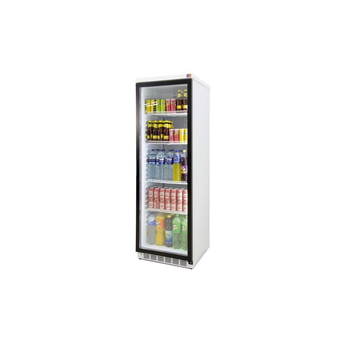 Armario Expositor Refrigerado, con puerta de cristal y cabezal iluminado. Tiene una capacidad de hasta 372 litros. Equipado con termómetro y control de la temperatura mecánico. El evaporador es estático asistido por ventilador. Incluye sistema de evaporación automático. Cuenta con luz LED y cristal doble templado. Capacidad: 455 latas de 33 cl.