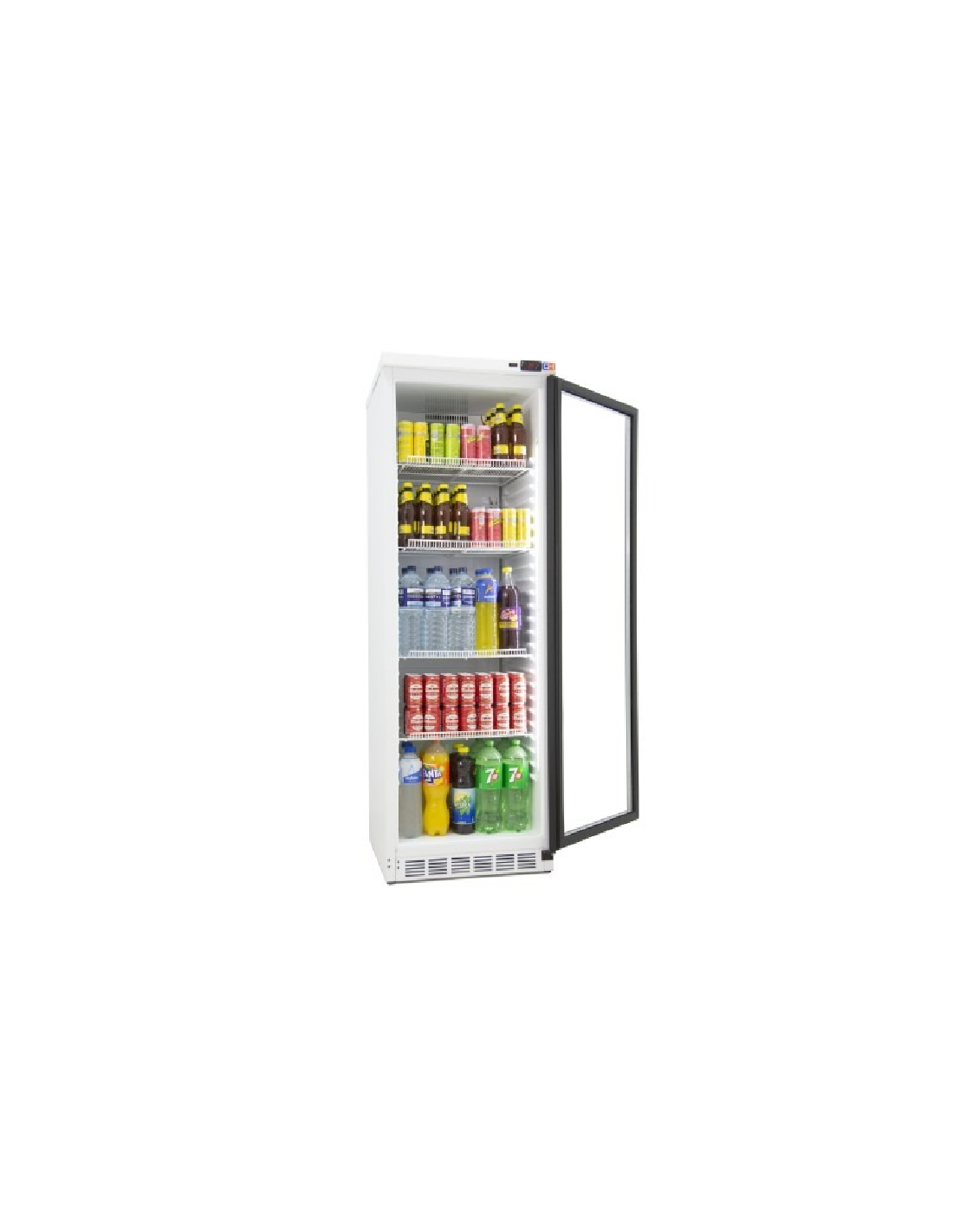 Armario expositor refrigerado, con puerta de cristal y capacidad de hasta 372 litros. Equipado con termómetro y control de la temperatura mecánico. El evaporador es estático asistido por ventilador. Incluye sistema de evaporación automático. Cuenta con luz LED y cristal doble templado. Capacidad: 455 latas de 33 cl.