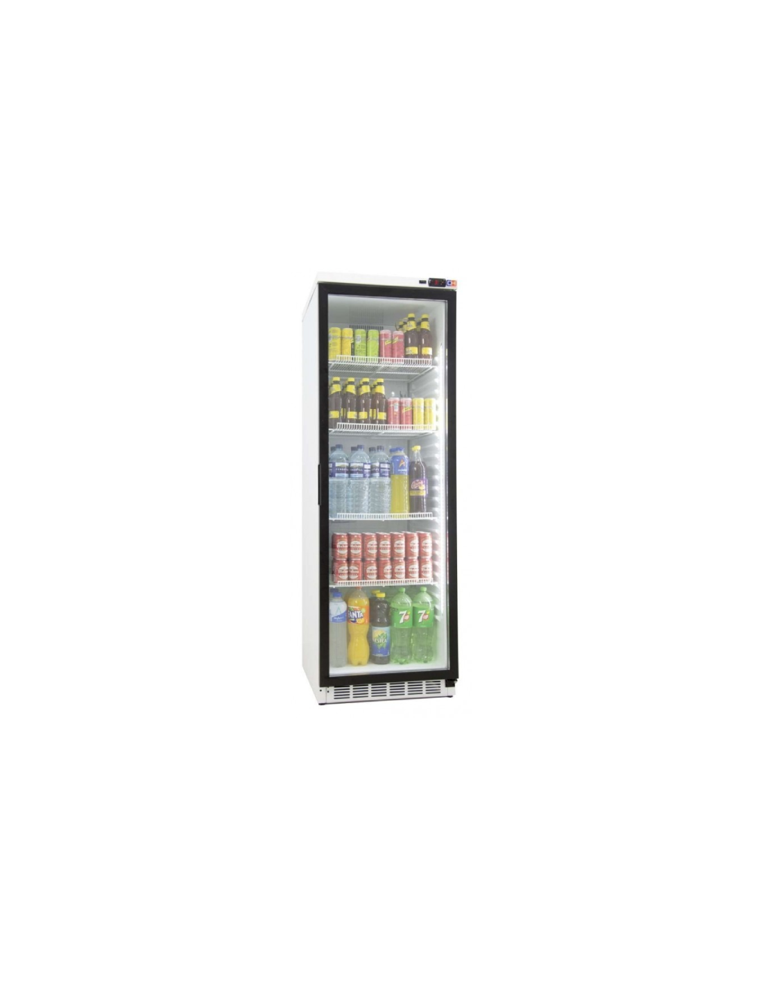 Armario Expositor Refrigerado, con puerta de cristal y cabezal iluminado. Tiene una capacidad de hasta 372 litros. Equipado con termómetro y control de la temperatura mecánico. El evaporador es estático asistido por ventilador. Incluye sistema de evaporación automático. Cuenta con luz LED y cristal doble templado. Capacidad: 455 latas de 33 cl.