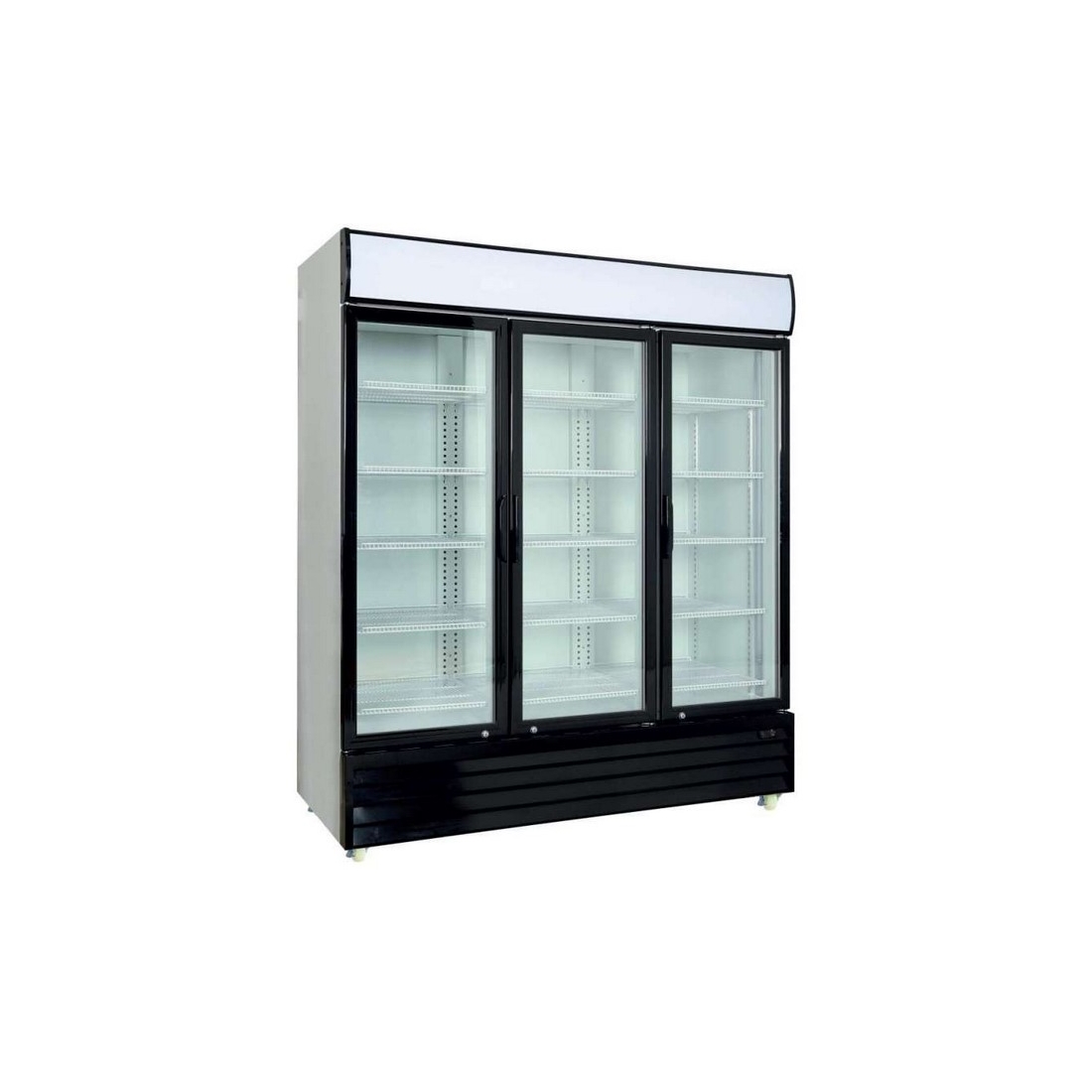 Armario frigorífico expositor de 3 puertas abatibles, con capacidad de hasta 1264 litros. Equipado con 12 estantes regulables en altura. Refrigeración ventilada, descarche automático, evaporador con recubrimiento anticorrosión. Capacidad: 1520 latas de 33cl.