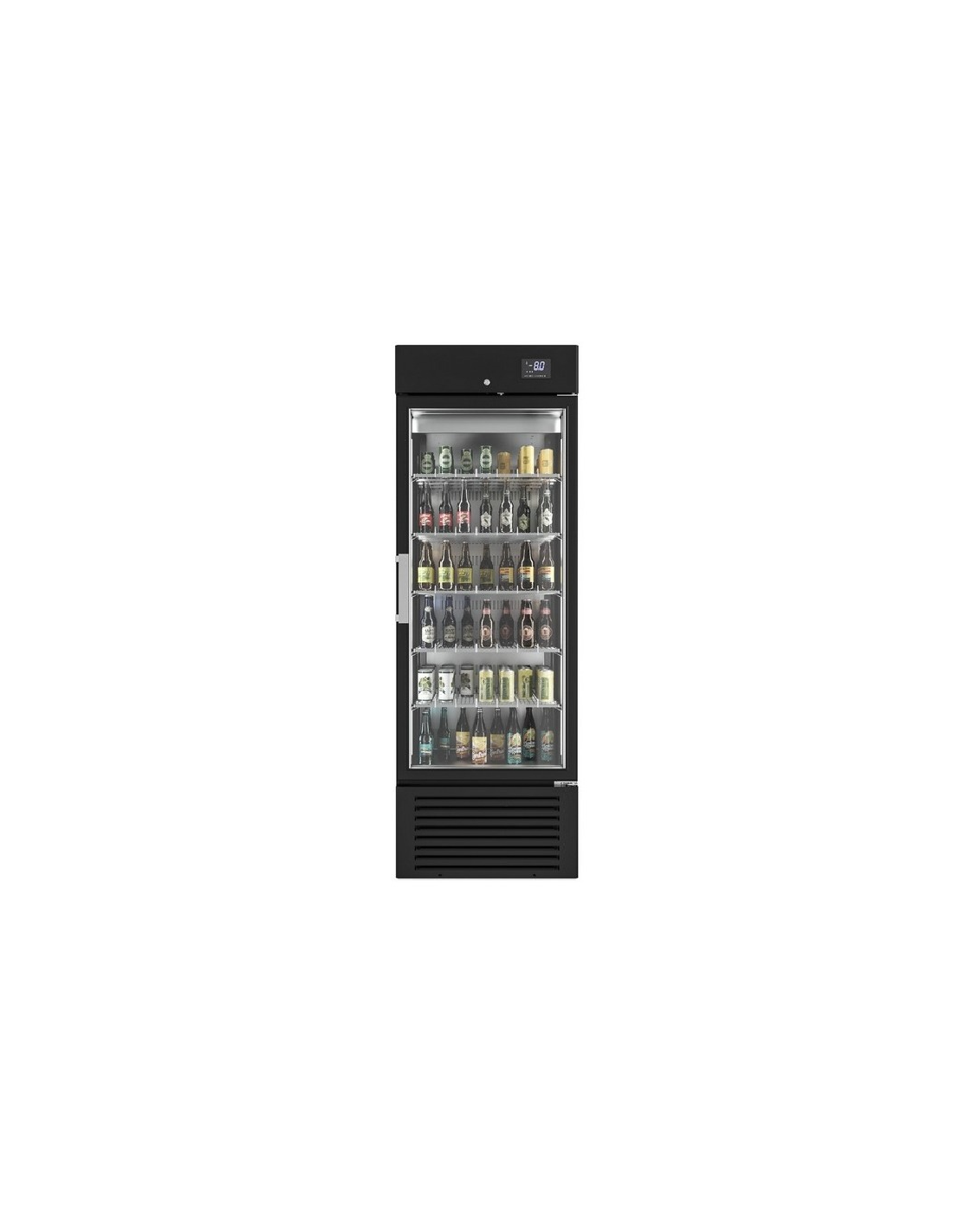 Armario expositor refrigerado de una puerta de cristal, con capacidad de 400 litros y 4 estantes de serie. Tiene el evaporador ventilado impreso en placa de aluminio. Está equipado con termostato mecánico y visor de temperatura digital. El compresor es hermético. Capacidad: 518 latas de 33cl.