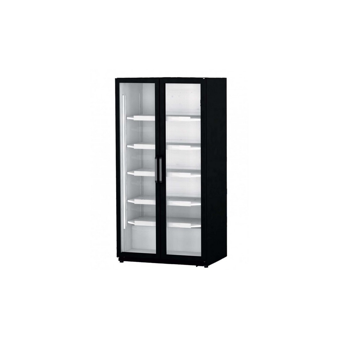 Armario expositor refrigerado 2 puertas correderas de cristal con capacidad de hasta 1000 litros. Cuenta con 8 estantes de serie. Incluye evaporador ventilado impreso en placa de aluminio. Tiene el termostato digital CAREL. Los desescarches son automáticos. Incluye luz interior LED y doble cristal CLIMALIT. Capacidad: 960 Latas de 33cl.