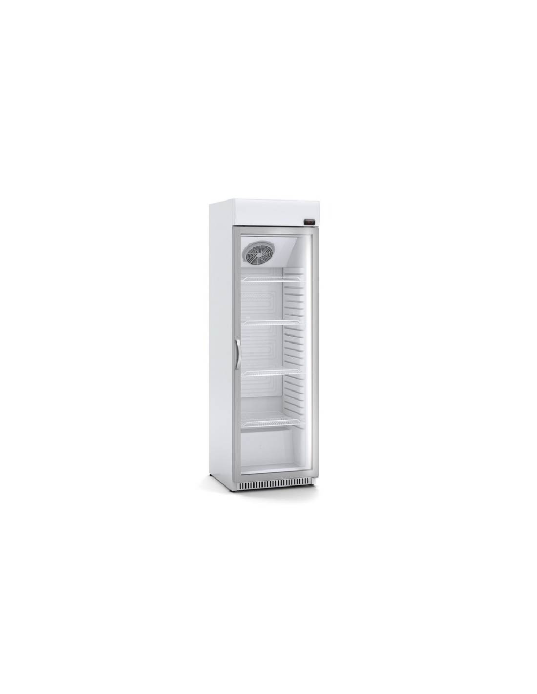 Armario expositor refrigerado de una puerta de cristal, con capacidad de 400 litros y 4 estantes de serie. Tiene el evaporador ventilado impreso en placa de aluminio. Está equipado con termostato mecánico y visor de temperatura digital. El compresor es hermético. Capacidad: 518 latas de 33cl.