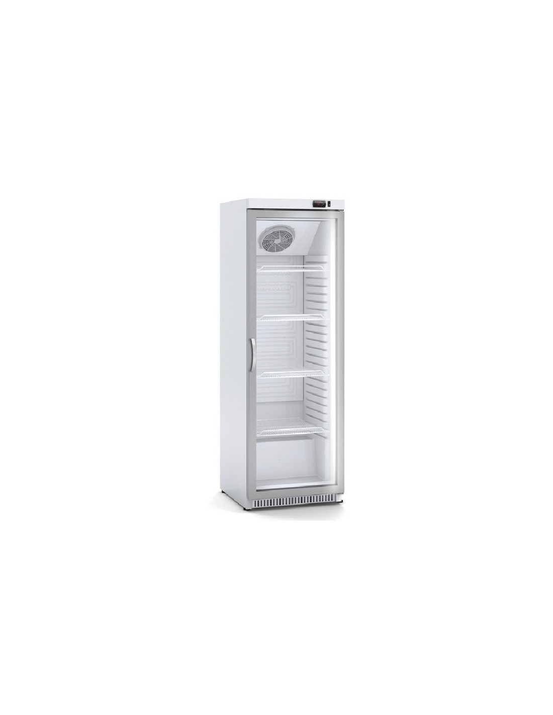 Armario Expositor Refrigerado, con puerta de cristal y cabezal iluminado. Tiene una capacidad de hasta 372 litros. Equipado con termómetro y control de la temperatura mecánico. El evaporador es estático asistido por ventilador. Incluye sistema de evaporación automático. Cuenta con luz LED y cristal doble templado. Capacidad: 455 latas de 33 cl.