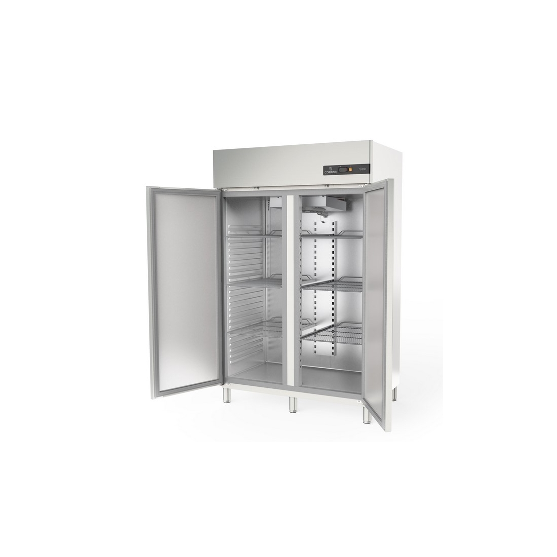 Nevera Industrial 2 puertas GN 2/1 CGR-1002-SPF de Coreco. Esta unidad tiene un gran volumen de 1404 litros y trabaja en un rango de temperatura ajustable entre -2°C y +8°C. Esta equipado con 6 estantes, patas ajustables, desescarche automático y evaporador ventilado de tiro forzado. Tiene una clasificación de eficiencia energética D. Su clase climática 5 lo hace adecuado para ambientes de hasta 40°C y 40% de humedad relativa.