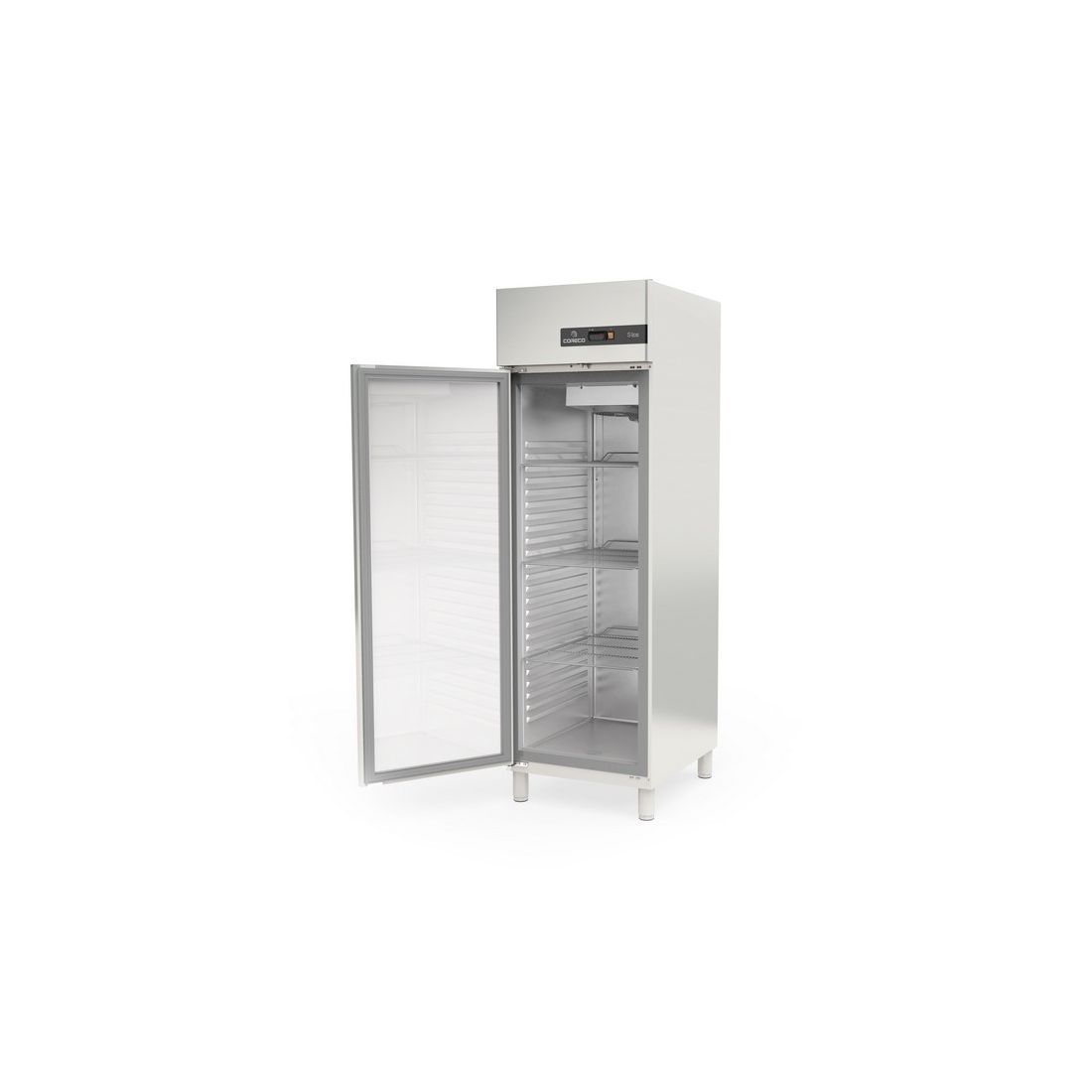 Nevera Industrial 1 Puerta GN 2/1 CGR-751-SPF de Coreco. Esta unidad tiene un gran volumen de 645 litros y trabaja en un rango de temperatura ajustable entre -2°C y +8°C. Esta equipado con 3 estantes, 24 guías, patas ajustables y un evaporador ventilado de tiro forzado. Tiene una clasificación de eficiencia energética C. Su clase climática 5 lo hace adecuado para ambientes de hasta 40°C y 40% de humedad relativa.