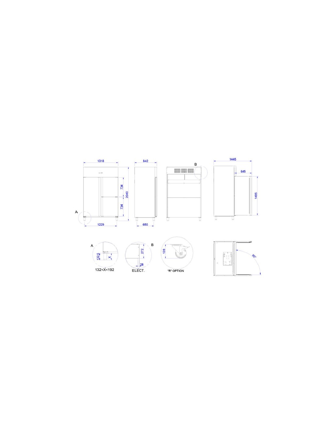 Armario refrigerado GN 2/1 de 1400 L con cuerpo y puertas en acero inoxidable. Temperatura regulable de -2 °C a +8 °C, aislamiento de 60 mm y control digital con alarma de puerta abierta. Potencia 0,337 kW. Medidas: 1318×842×2040 mm. Clase energética C.