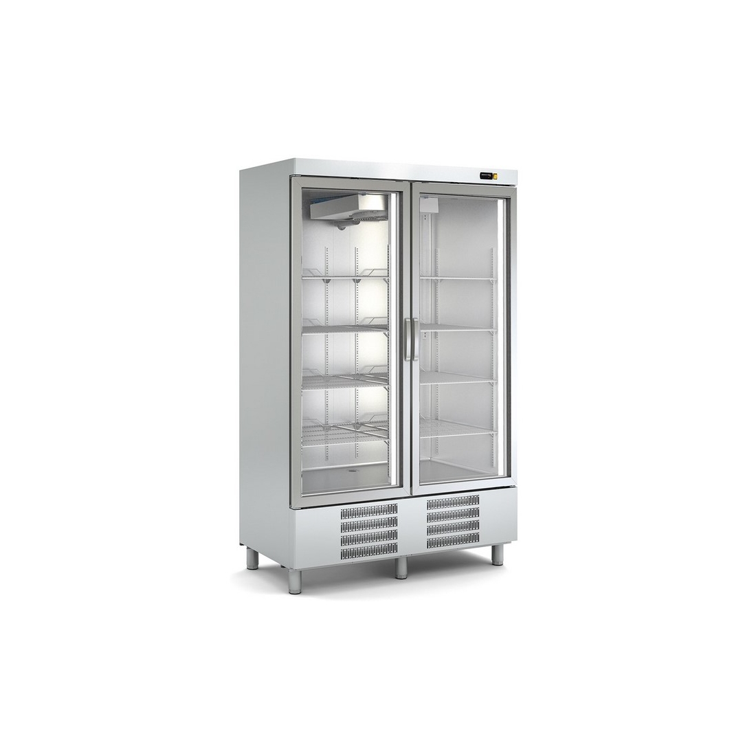 Nevera para hostelería de 1201 litros, diseñada en acero inoxidable con puertas de cristal. Medidas 1350 x 735 x 2160 mm. Temperatura ajustable (-2°C a +8°C). Cuenta con estantes ajustables, sistema de tiro forzado, control digital de temperatura y desescarches automáticos.