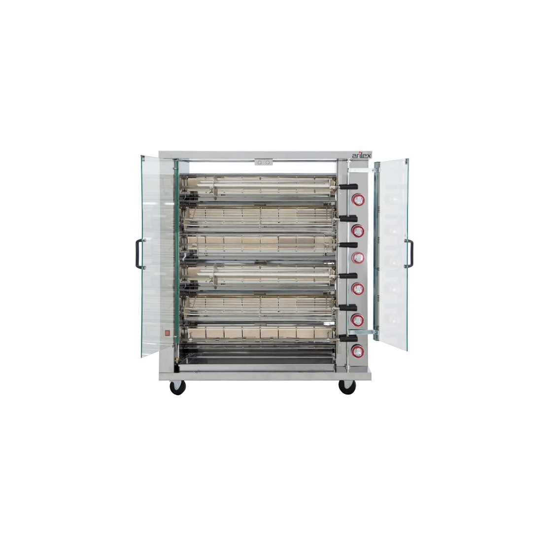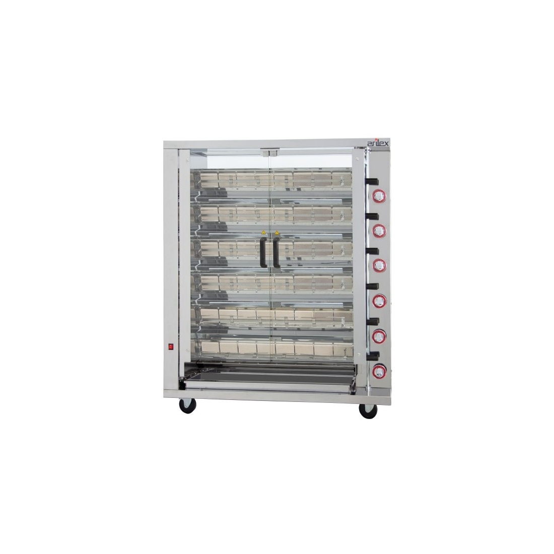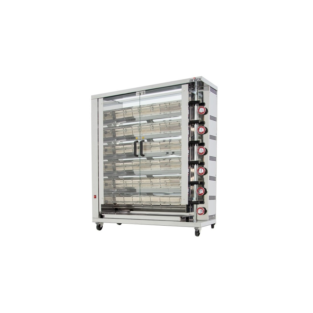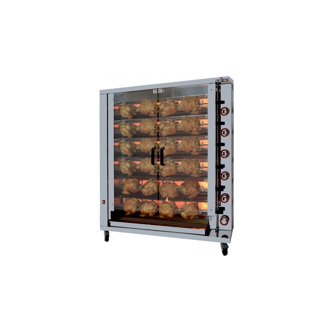 Asador de pollos con 6 espadas a gas. Tienen una capacidad entre 24 y 36 pollos. Quemadores muy potentes con gran poder calorífico. Estos asadores disponen de una gran variedad de accesorios que permiten asar pollo, conejo, paletilla de cordero, pavo, cochinillo, jamones, codillo, patata, pimiento, chorizo, butifarra...
