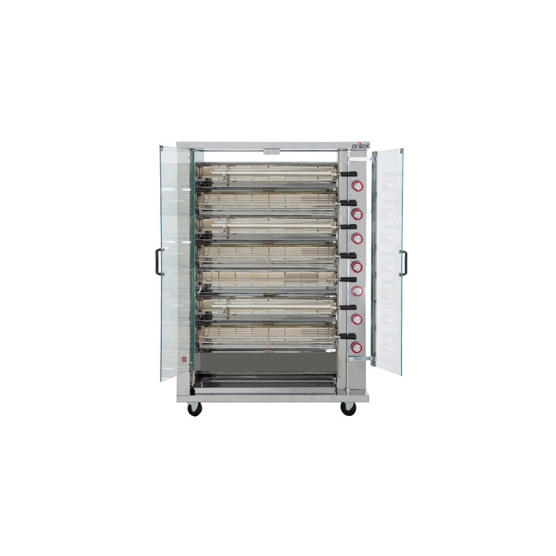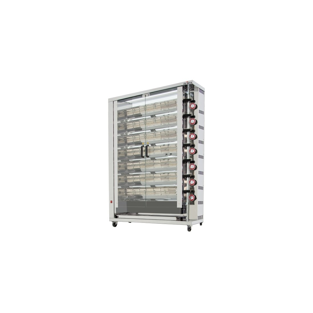 Asador de pollos con 7 espadas a gas. Tienen una capacidad entre 28 y 42 pollos. Quemadores muy potentes con gran poder calorífico. Estos asadores disponen de una gran variedad de accesorios que permiten asar pollo, conejo, paletilla de cordero, pavo, cochinillo, jamones, codillo, patata, pimiento, chorizo, butifarra...