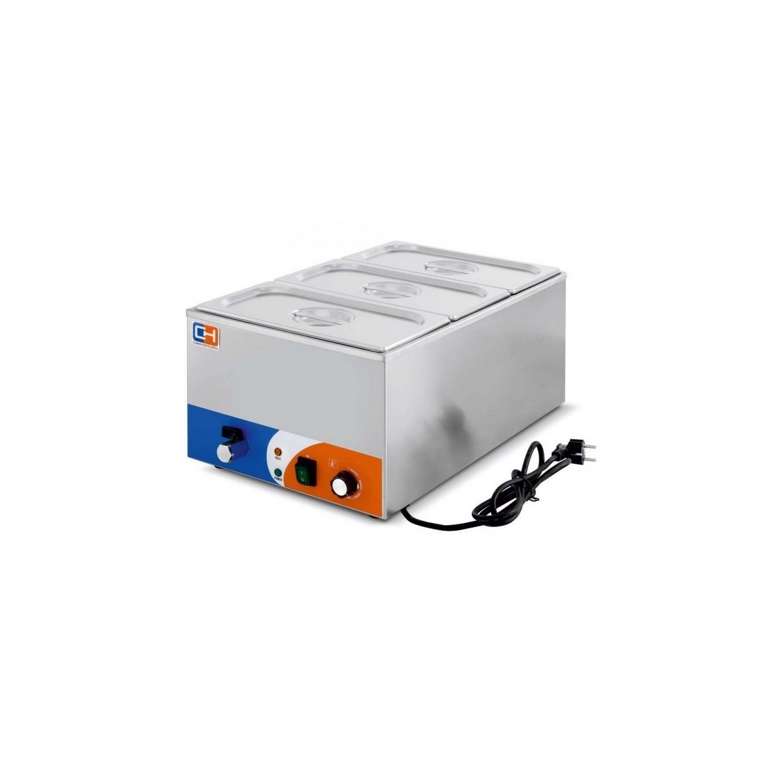 - Es un aparato eléctrico que calienta un baño de agua en el que se introducen las bandejas GN con los alimentos. El agua se emplea pues como trasmisor del calor y se mantiene por debajo del punto de ebullición a una temperatura máxima constante de 95°C, de manera que los alimentos conserven su textura y sabor.