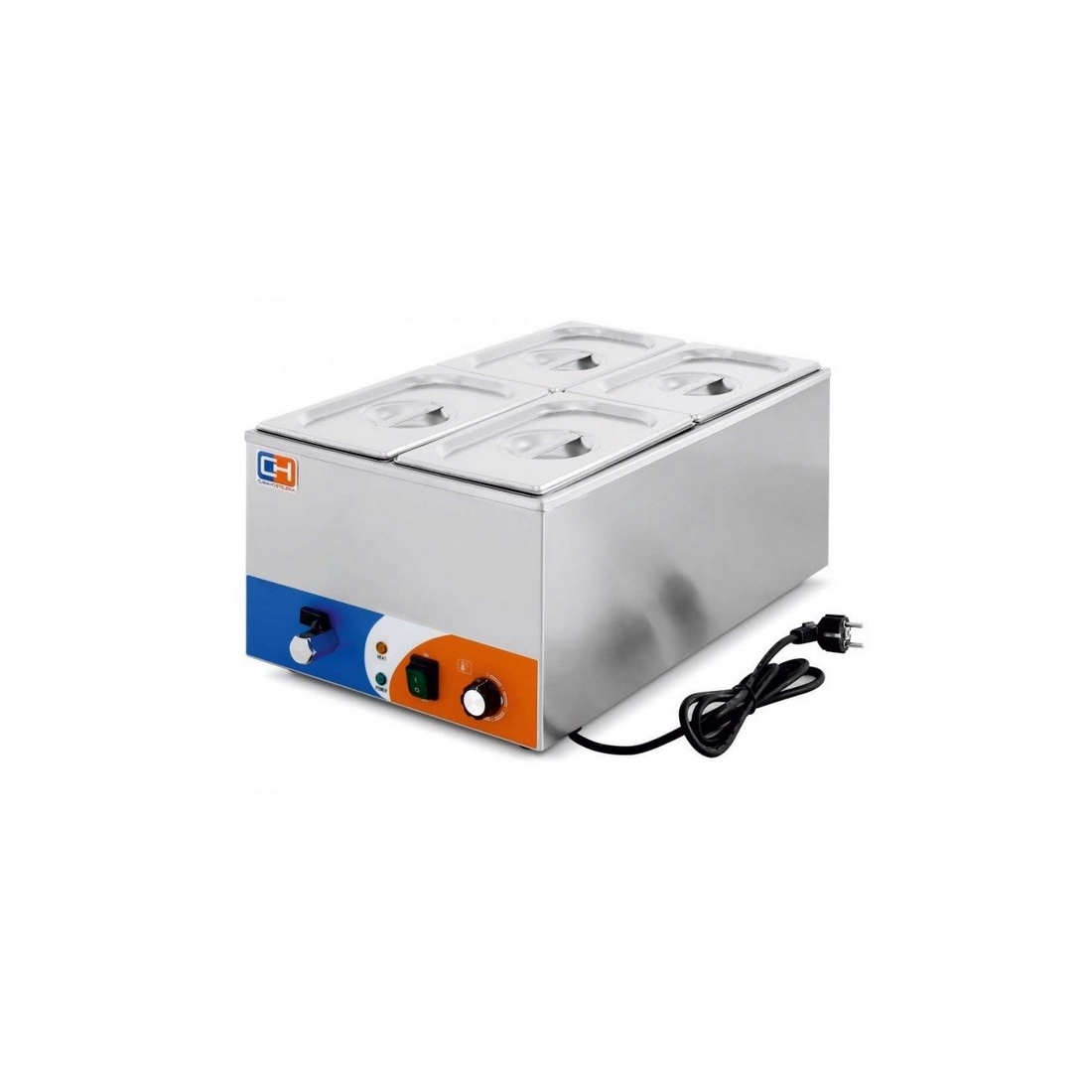 - Es un aparato eléctrico que calienta un baño de agua en el que se introducen las bandejas GN con los alimentos. El agua se emplea pues como trasmisor del calor y se mantiene por debajo del punto de ebullición a una temperatura máxima constante de 95°C, de manera que los alimentos conserven su textura y sabor.