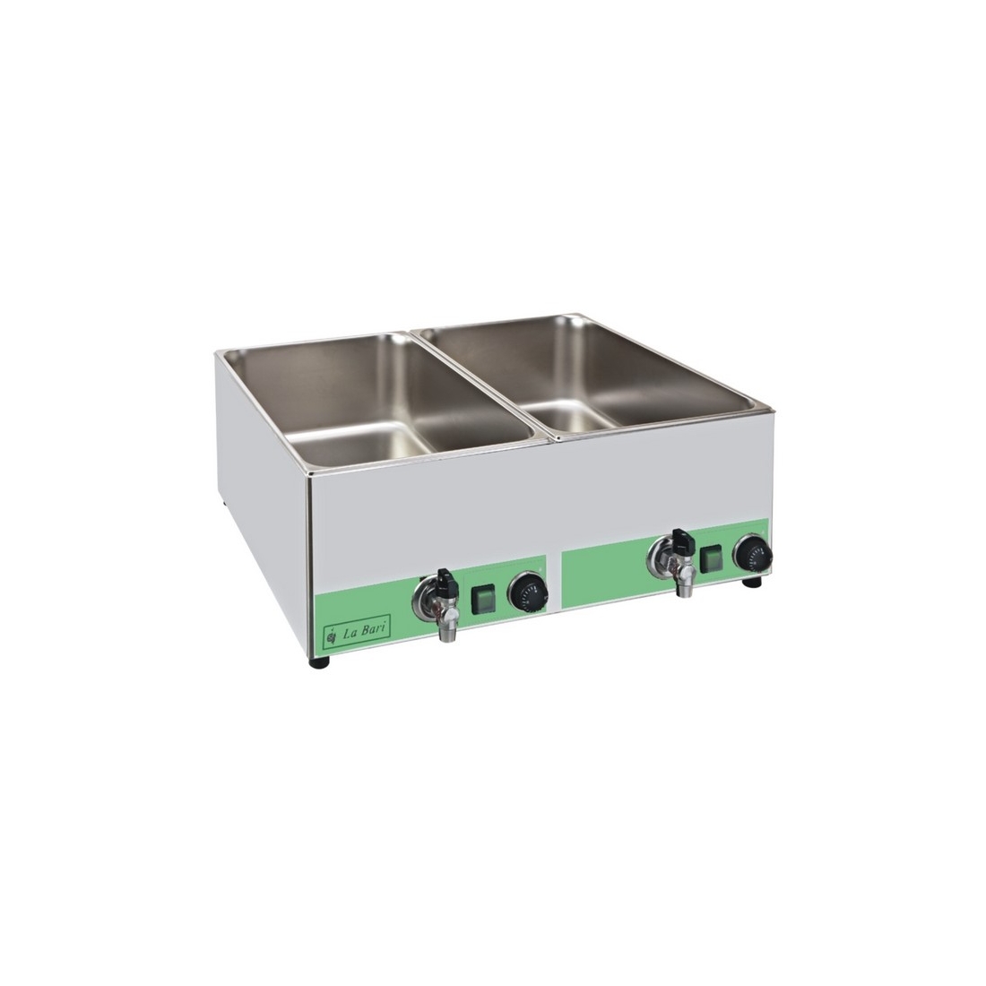 Baño maría eléctrico fondo 700mm con 2 cubetas GN1/1 - 150 mm. Se puede utilizar de manera versátil, ya que permite tener los distintos componentes de un plato por separado, por ejemplo, carne, patatas y salsa.