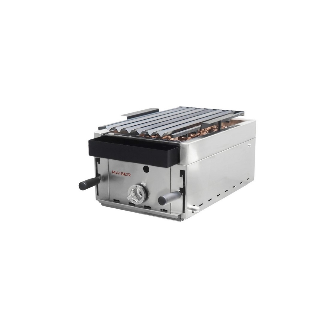 Barbacoa a gas profesional pequeña, con superficie útil de: 53 x 50cm. Parrilla regulable en 2 alturas. Quemadores tubulares Italianos. Cuenta con una potencia de: 12,6 Kw. ¡Con bolsa de 6Kg de piedra volcánica incluida!
