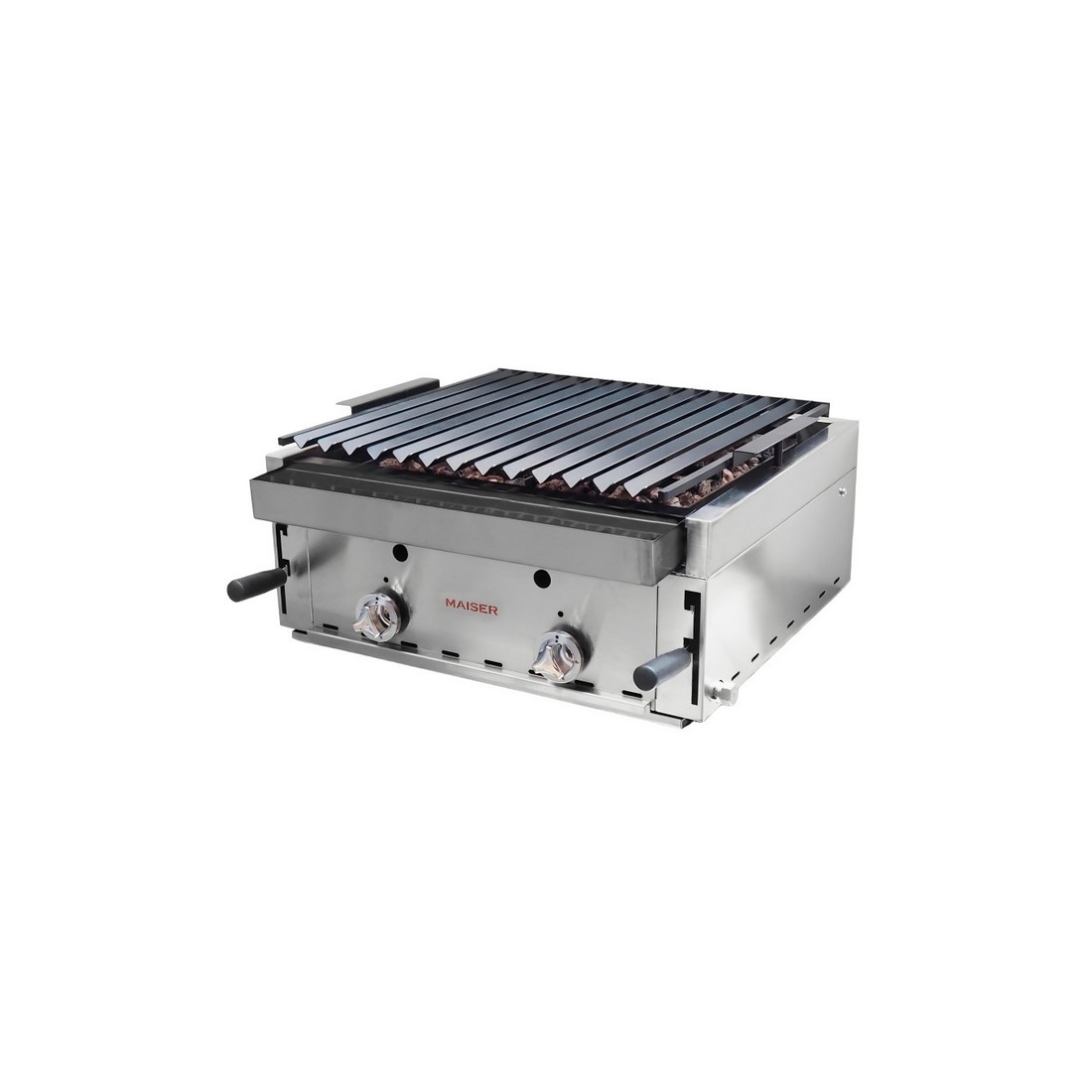 Barbacoa de piedras volcánicas a gas de 70cm. Con una superficie útil de 610 x 396mm esta parrilla profesional está equipada con quemadores tubulares de gran poder calorífico "sin zonas Frías". Cuenta con parrilla acanalada de acero inoxidable regulable en 2 alturas. Fabricada en España con materiales de alta calidad. 3 Kg de Piedras volcánicas incluidas.