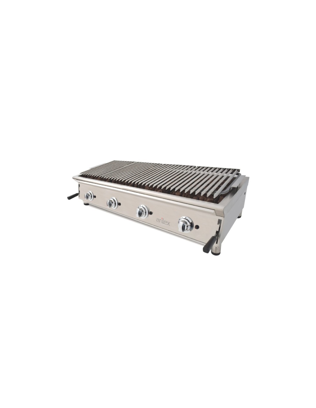 Barbacoa Piedras Volcánicas 130cm Regulable Arilex, diseñada para cocinas profesionales que requieren una zona de asado potente y estable. Su sistema de 8 quemadores distribuye el calor de forma uniforme sobre la piedra volcánica, permitiendo un cocinado constante y controlado incluso en servicios de alta demanda.