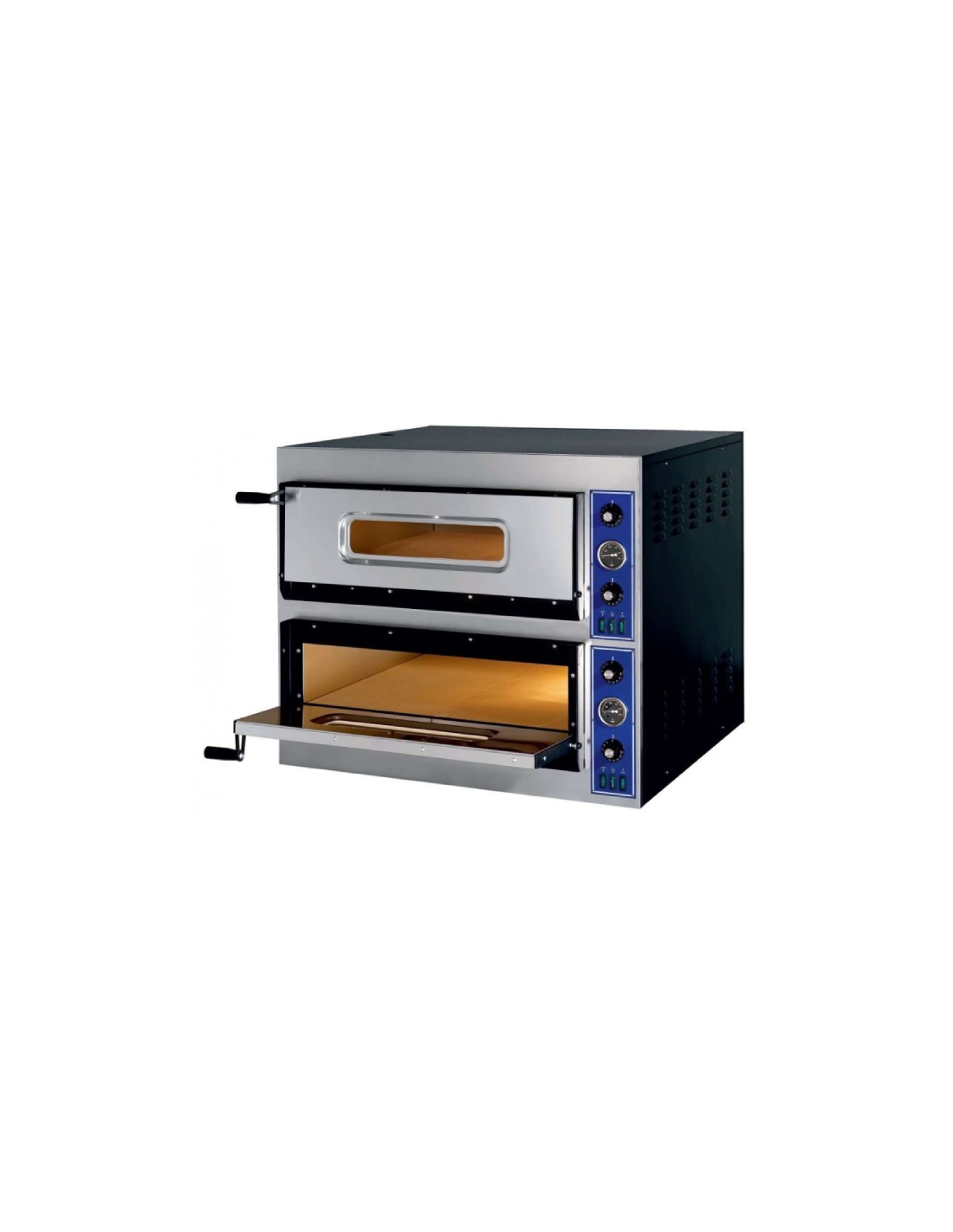 Horno eléctrico profesional con doble cámara para 12 pizzas de 33 cm. Temperatura máxima de 500 °C, resistencias acorazadas y piedra refractaria. Aislamiento de lana de roca, luz interior y control electromecánico. Medidas: 900 × 1080 × 750 mm. Potencia: 14,4 kW. Tensión: 400 V.