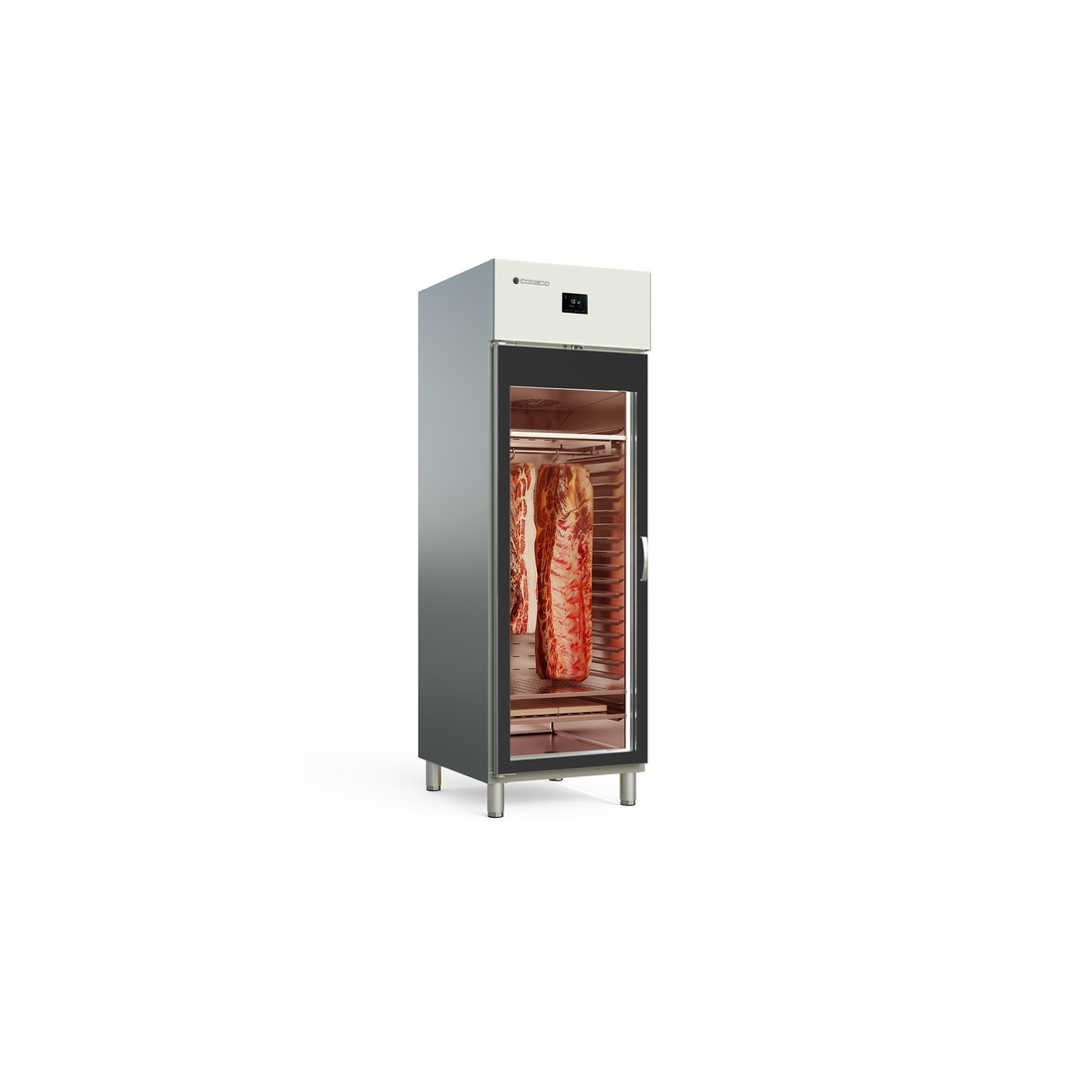 Nevera de maduración "DRY AGING". Tiene una capacidad de 400 litros. Cuenta con un sistema de refrigeración ventilado y un control de temperatura - humedad electrónico. Además, está equipado con 2 estantes ajustables, puertas con cierre automático y una iluminación interior LED.