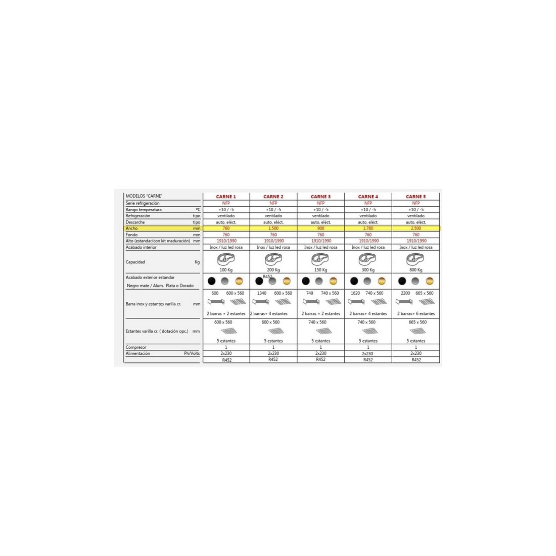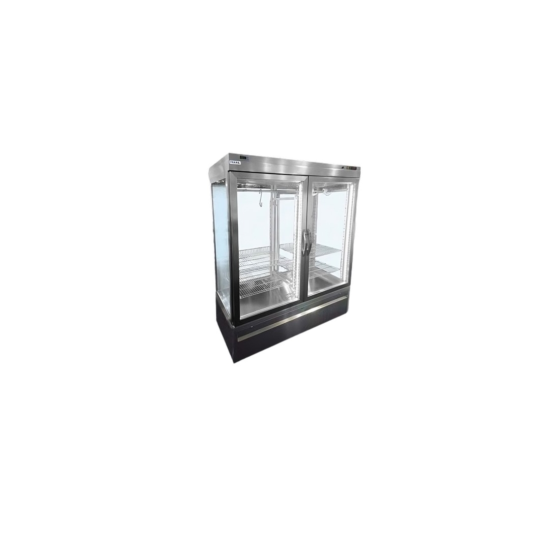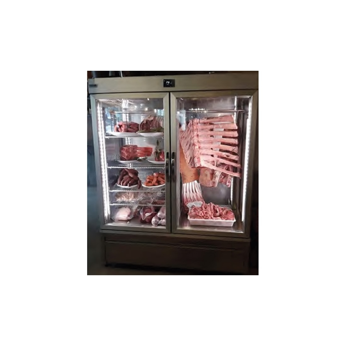 Cámara mostrador de maduración "DRY AGING". Incluye control digital IP65, sistema de refrigeración ventilada y humidificación. Capacidad de 710 litros. Cuenta con un sistema de iluminación LED con tonalidad especial para carne. Medidas: 2011 x 740x 1060 mm. Acabado en color negro.