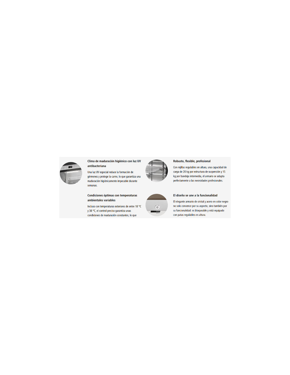 Nevera para madurar carne de gran capacidad. Cuenta con un rango de temperatura de +2°C a +14°C, humedad controlada del 50 al 85 %, y una capacidad total de 380 litros repartidos en 7 estantes, 2 barras carniceras y 6 ganchos. La capacidad de carga por estante es de 80 kg.
