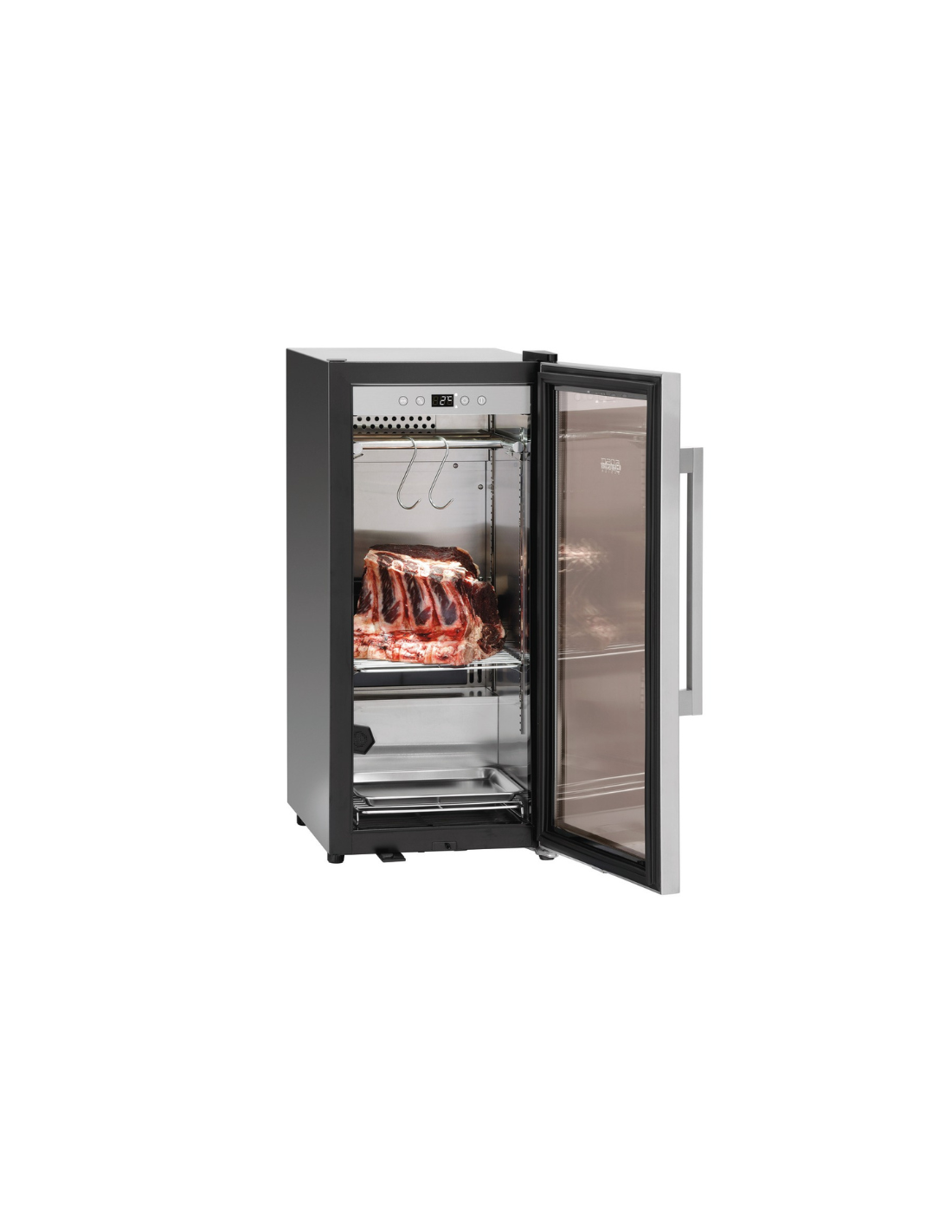 Vitrina mostrador de maduración "DRY AGING". Incluye control digital IP65, sistema de refrigeración ventilada y humidificación. Capacidad de 470 litros. Cuenta con un sistema de iluminación LED con tonalidad especial para carne. Acabado en inox.