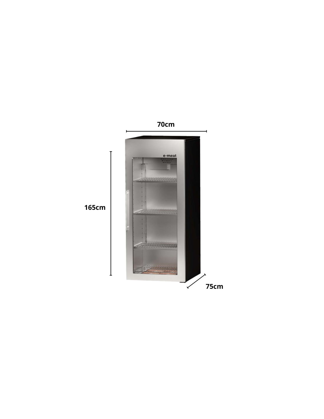 Este madurador de carne cuenta con una capacidad de 496 Litros. Está equipado con 4 estantes, con una carga máxima de 40 Kg por unidad. Entre sus características mas destacadas se encuentran el Filtro de carbón activo, los bloques de Sal del Himalaya, el termostato y humidostato regulables.