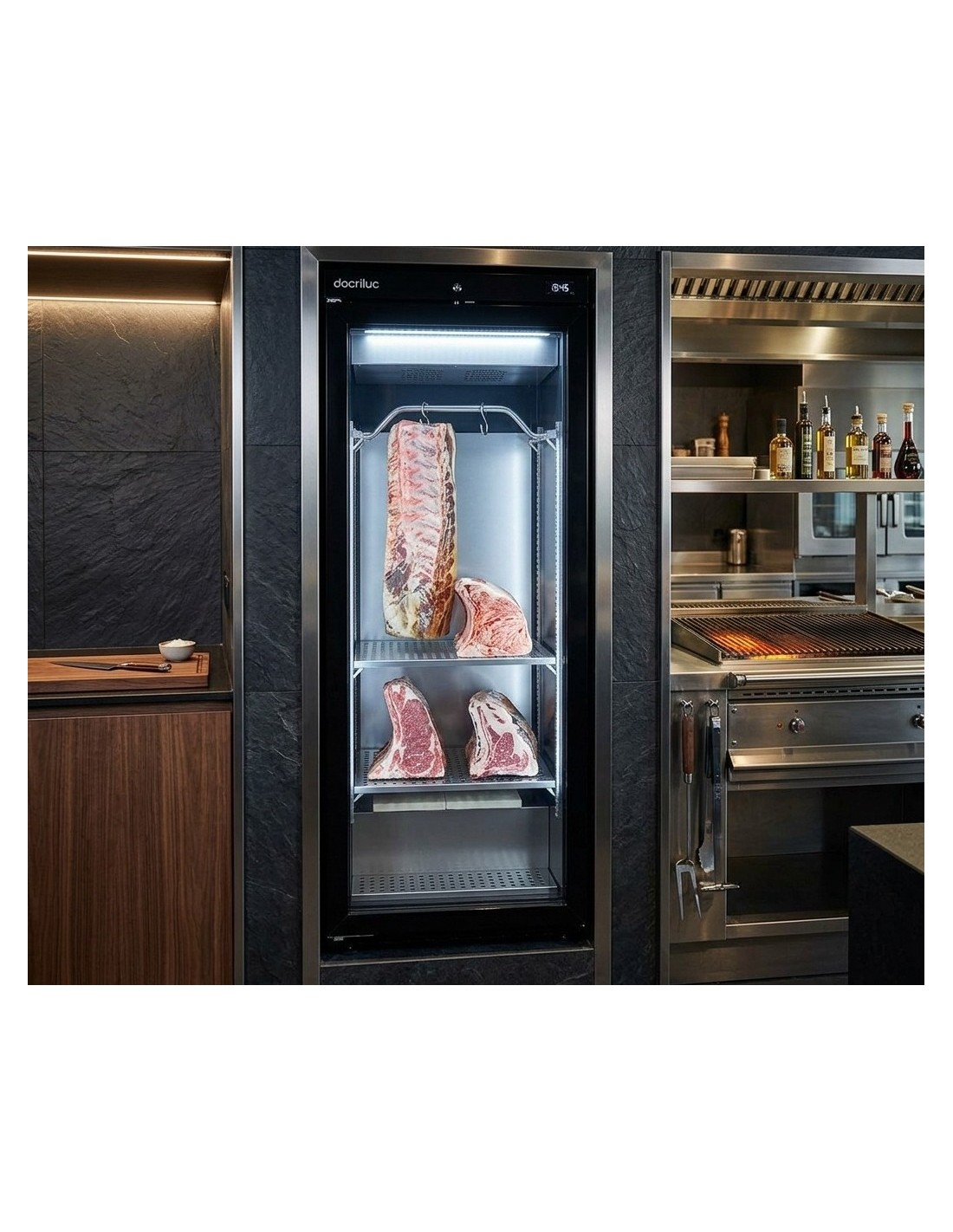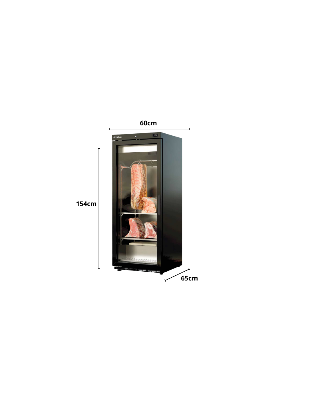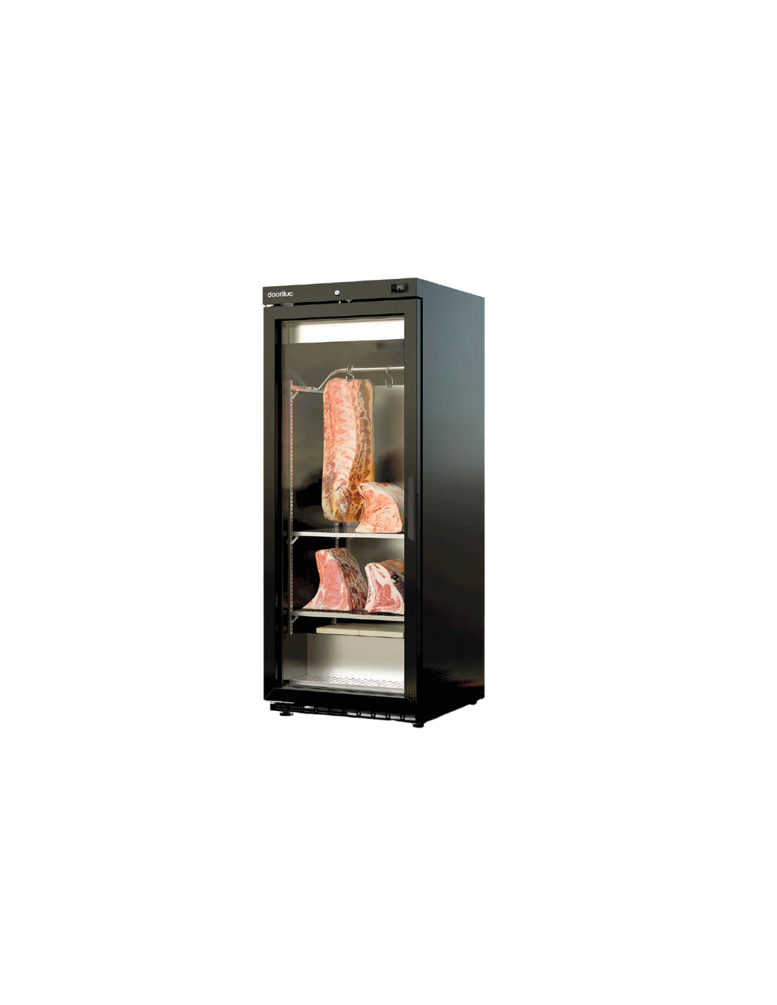 Madurador "DRY AGING" de gran capacidad, 240 litros. Incorpora sistema de enfriamiento con ventilación y control electrónico de temperatura y humedad. Incluye 2 estantes ajustables y 1 barra carnicera. Las puertas tienen cierre automático y luz LED interior.
