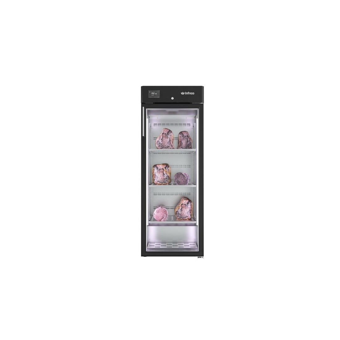 Nevera de maduración "DRY AGING". Tiene una capacidad de 400 litros. Cuenta con un sistema de refrigeración ventilado y un control de temperatura - humedad electrónico. Además, está equipado con 2 estantes ajustables, puertas con cierre automático y una iluminación interior LED.