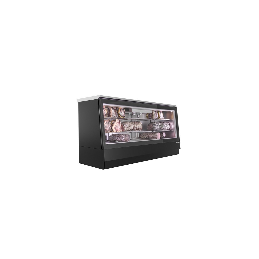 Nevera de maduración de carne sobre mostrador "DRY AGING". Tiene una capacidad de 200 litros. Cuenta con un sistema de refrigeración ventilado y un control de temperatura - humedad electrónico. Además, está equipado con 2 estantes ajustables, puertas con cierre automático y una iluminación interior LED. Dispone de ventanas laterales y puerta de cristal.