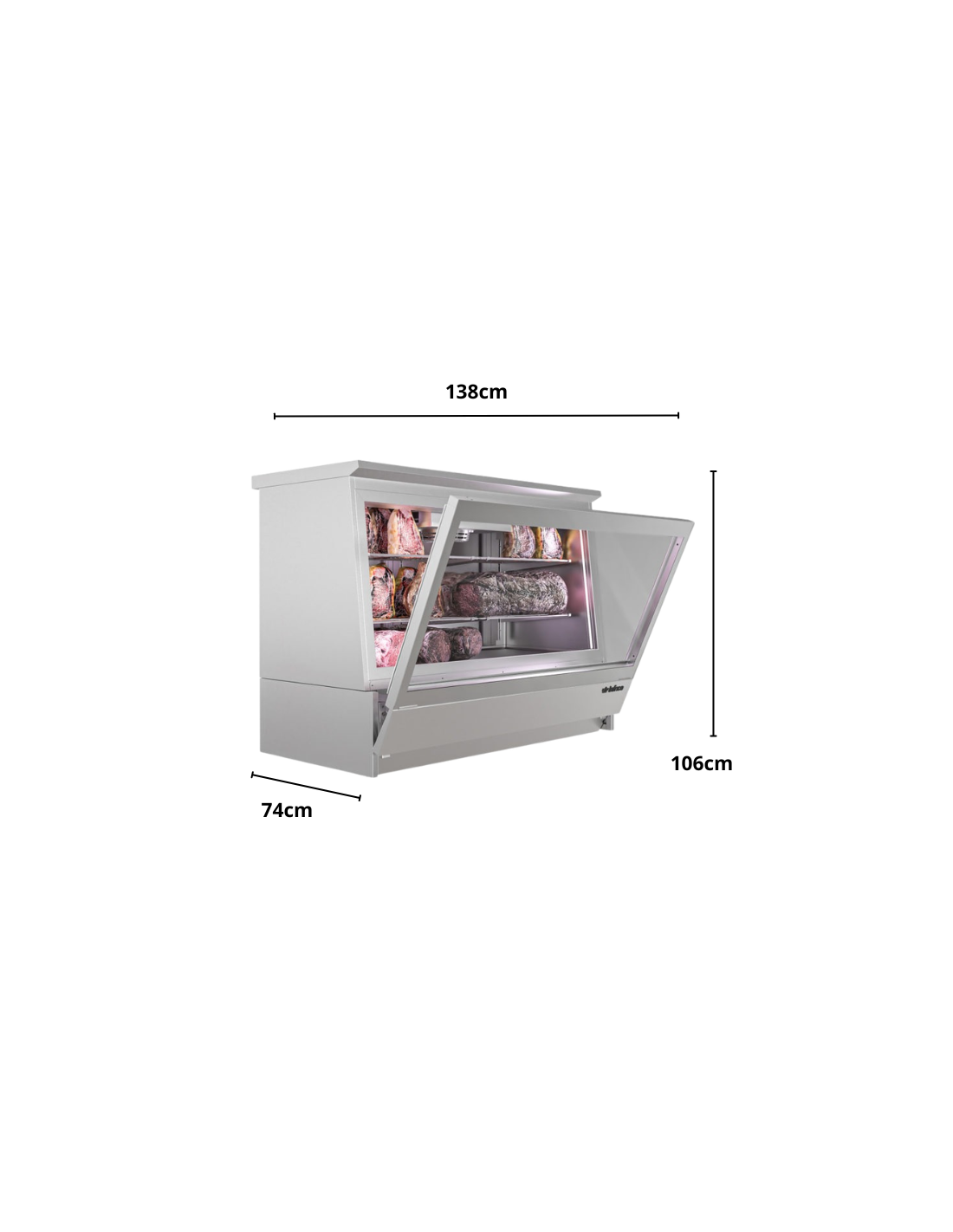 Este madurador de carne cuenta con una capacidad de 140 Litros. Está equipado con 2 estantes, con una carga máxima de 40 Kg por unidad. Entre sus características mas destacadas se encuentran el Filtro de carbón activo, los bloques de Sal del Himalaya, el termostato y humidostato regulables.