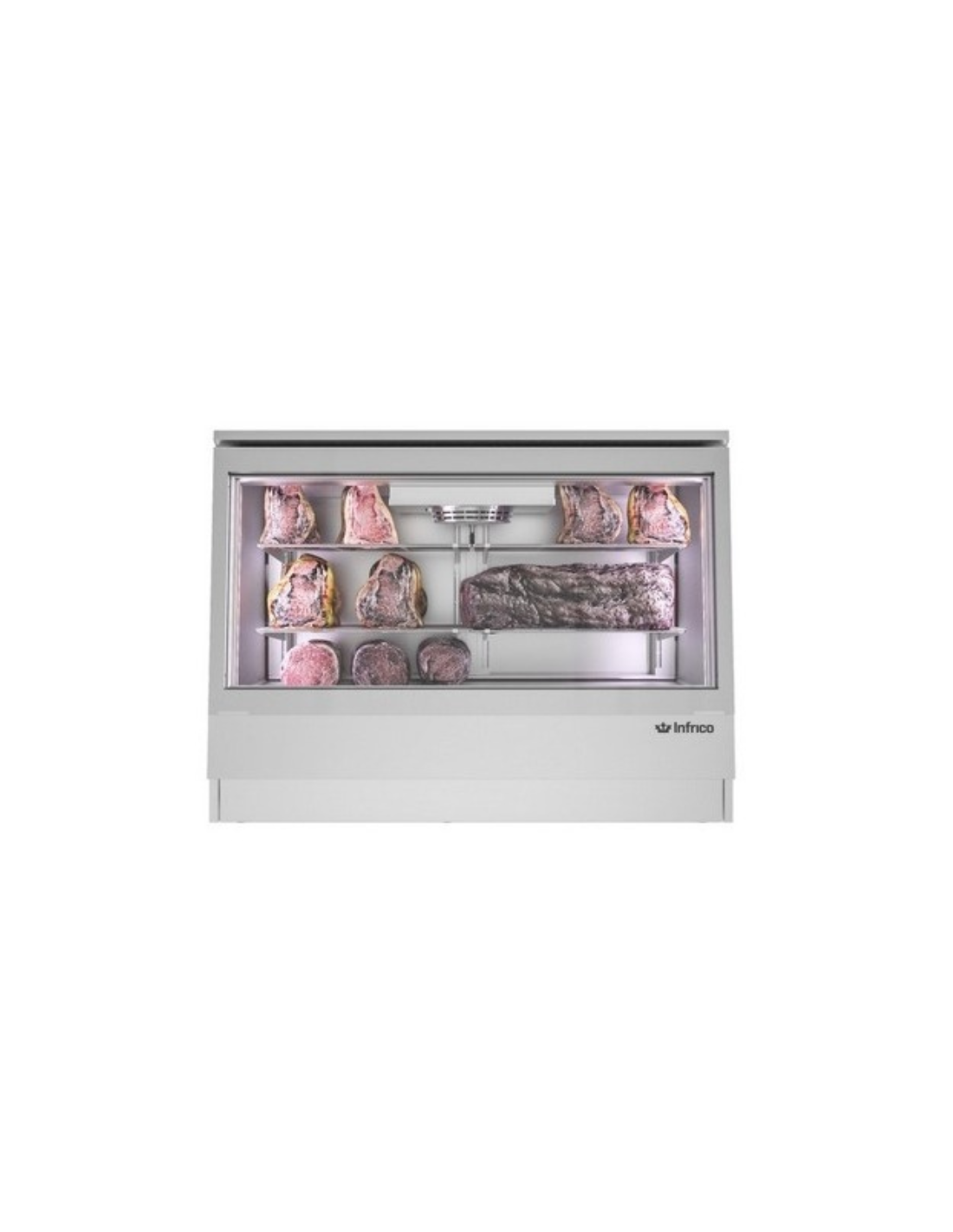 Cámara mostrador de maduración "DRY AGING". Incluye control digital IP65, sistema de refrigeración ventilada y humidificación. Capacidad de 710 litros. Cuenta con un sistema de iluminación LED con tonalidad especial para carne. Medidas: 2011 x 740x 1060 mm. Acabado en color negro.