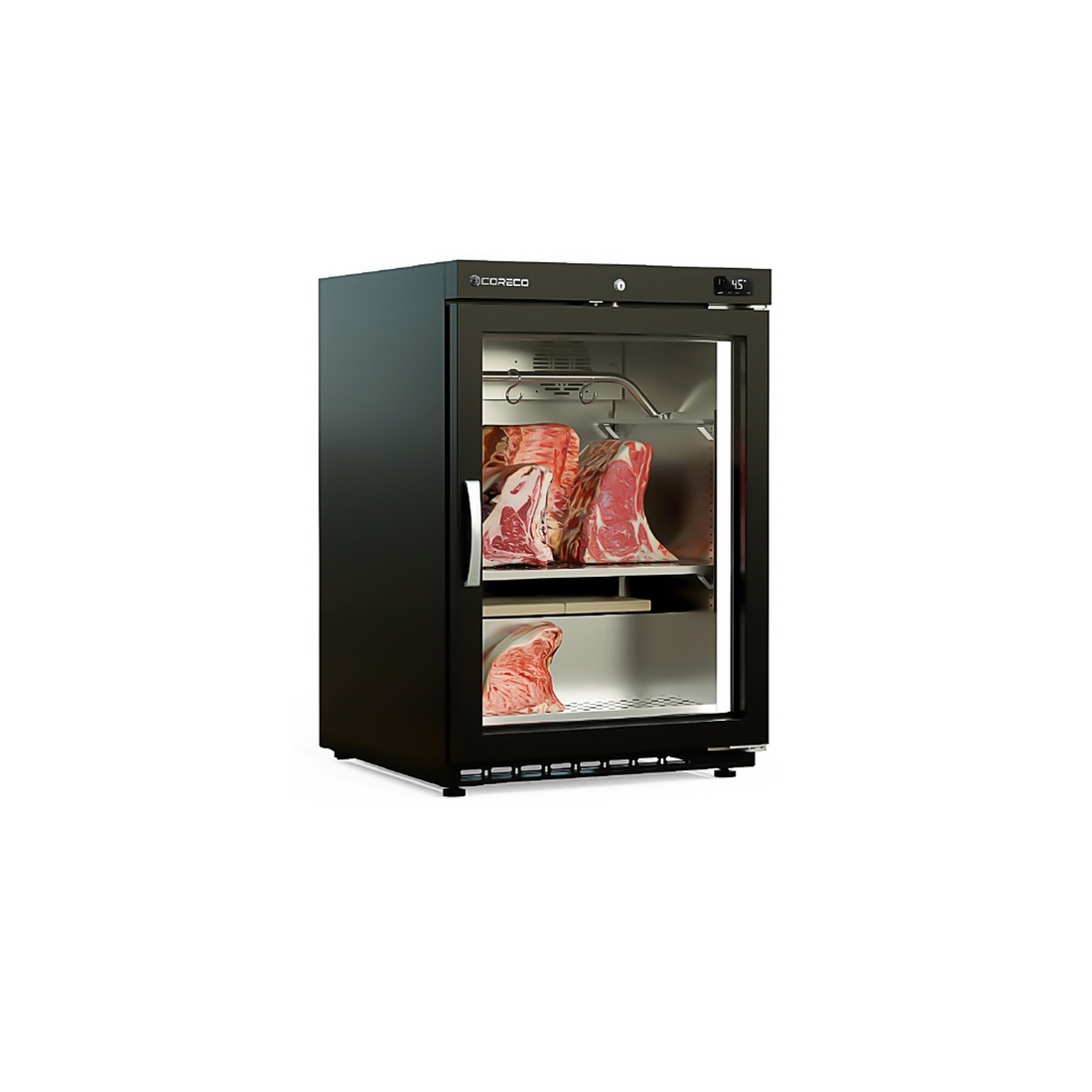 Nevera de maduración "DRY AGING". Tiene una capacidad de 400 litros. Cuenta con un sistema de refrigeración ventilado y un control de temperatura - humedad electrónico. Además, está equipado con 2 estantes ajustables, puertas con cierre automático y una iluminación interior LED.
