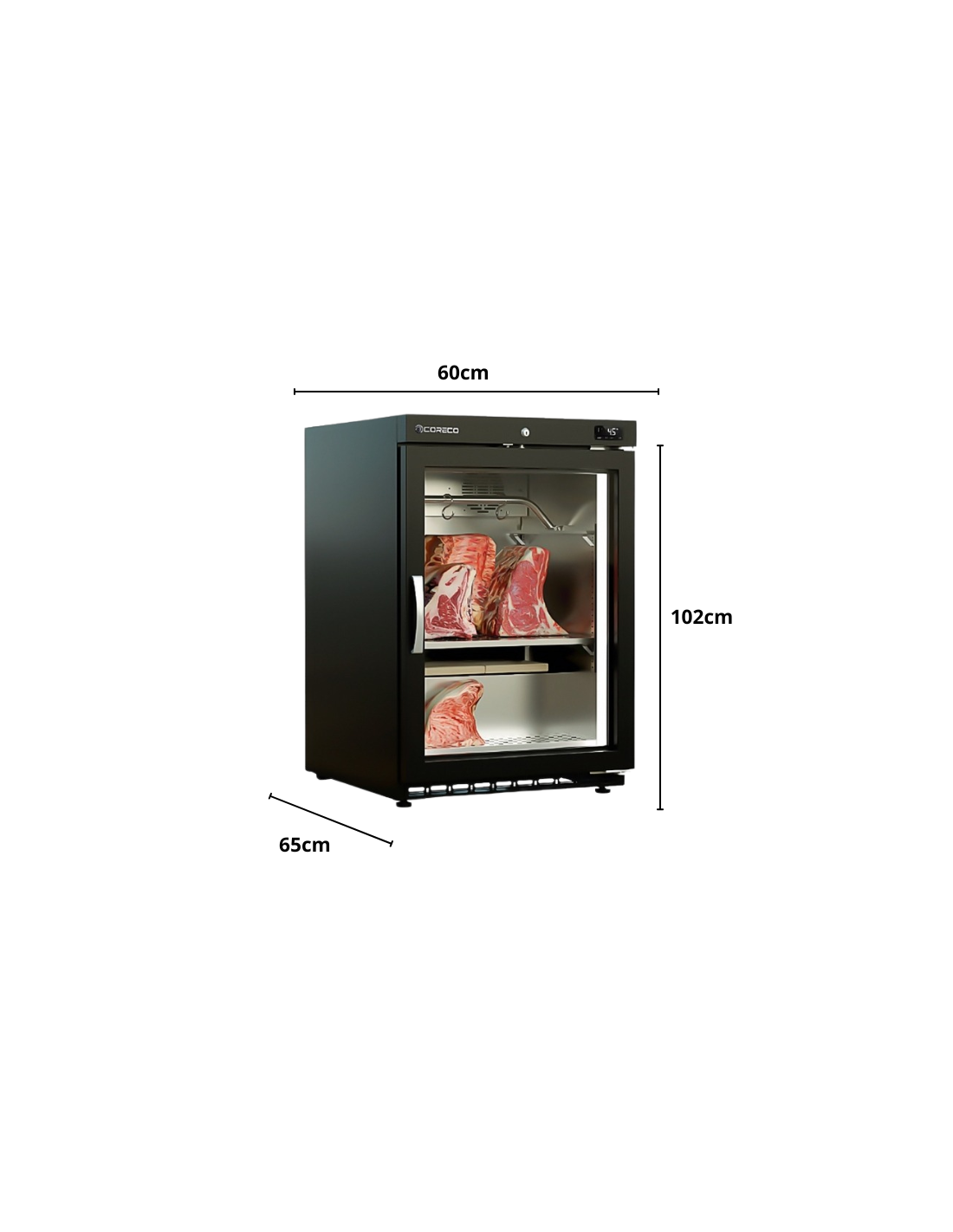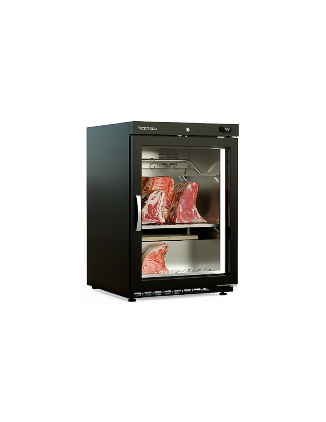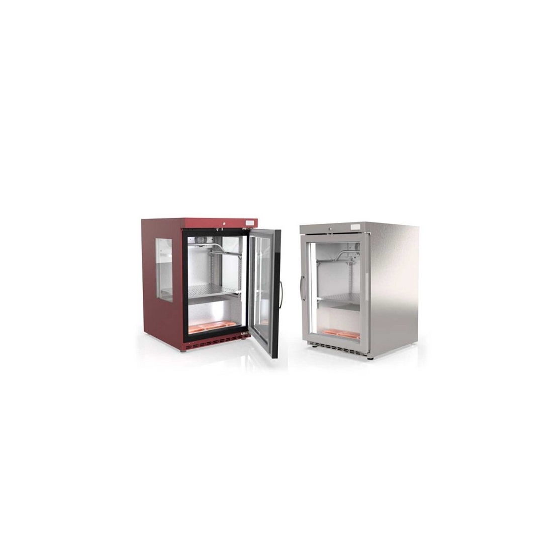 Nevera de maduración sobre mostrador "DRY AGING". Tiene una capacidad de 200 litros. Cuenta con un sistema de refrigeración ventilado y un control de temperatura - humedad electrónico. Además, está equipado con 2 estantes ajustables, puertas con cierre automático y una iluminación interior LED.