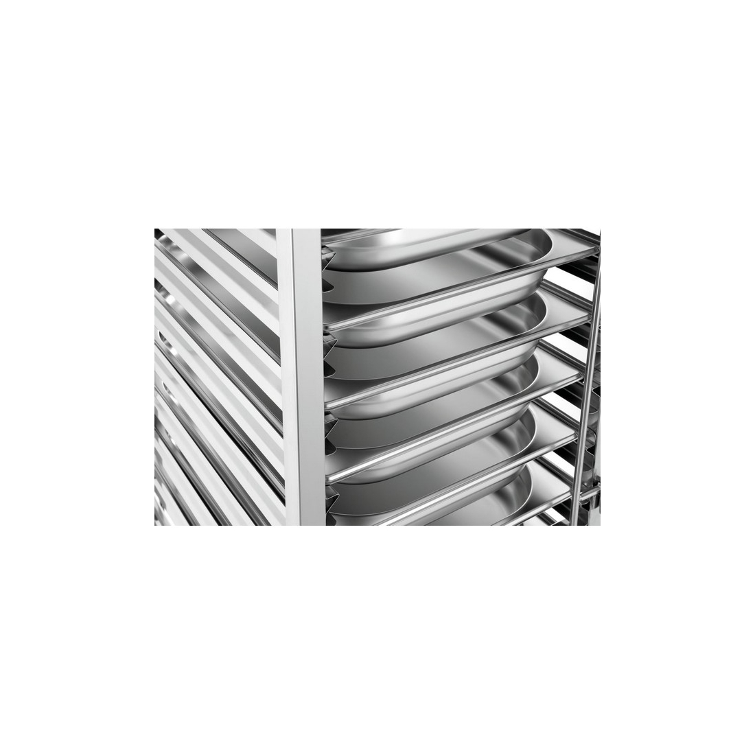 - Carro de 18 guías para bandejas GN 1/1, GN 1/2 y GN 1/3, construido en acero inoxidable.