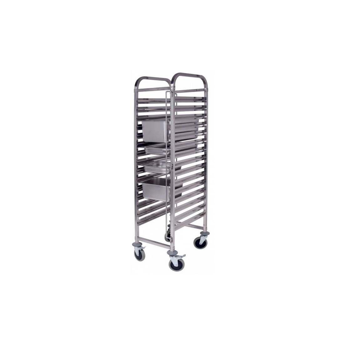 Carro bandejero para gastronomía con capacidad de 18 bandejas. Posibilidad de bandeja: GN 1/1, GN 1/2 y GN 1/3. Distancia entre bandejas: 80mm. Peso máximo por bandeja: 10Kg. Seguro antivuelco.