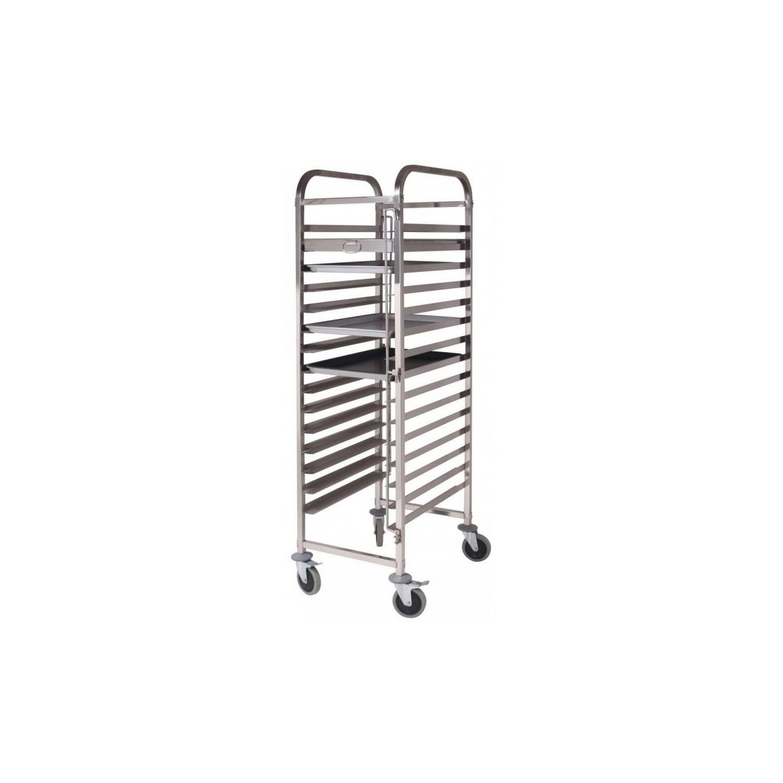 Carro de bandejas para hostelería doble con 30 guías de bandejas Gastronorm GN 1/1. Cuenta con 4 ruedas, dos de ellas con freno y sistema de cierre lateral para evitar la caída de las bandejas durante el desplazamiento.